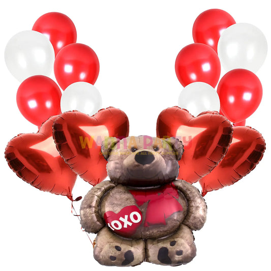 Red Heart Shape Foil Balloon w/ Small Pink Teddy Combo for Valentines Day/ Theme Party - 6PC