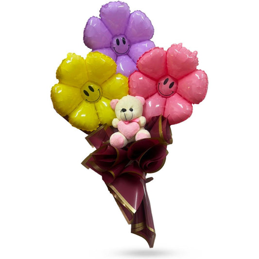 Smiling Flower Foil Balloon Bouquet w/Teddy Bear - 3PC