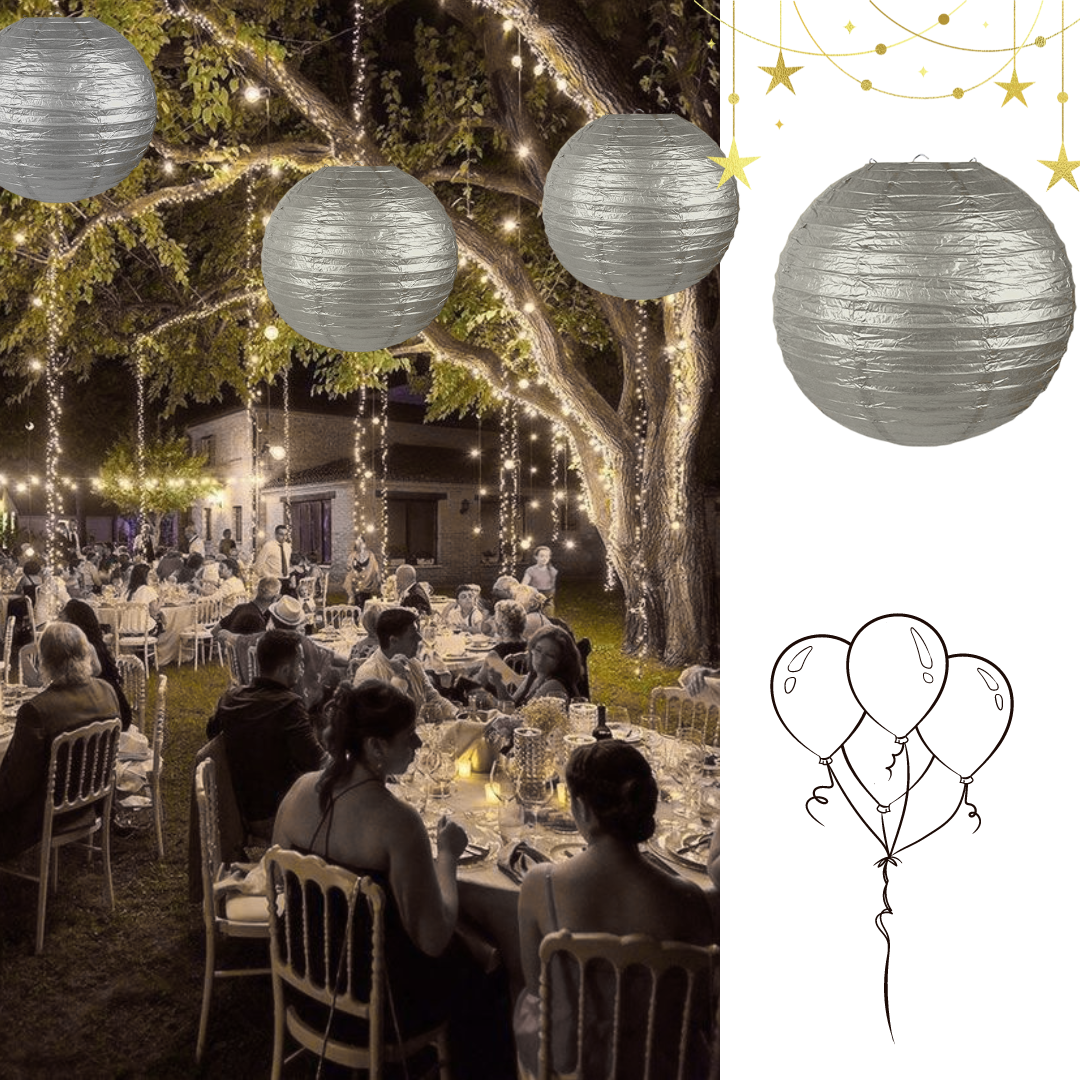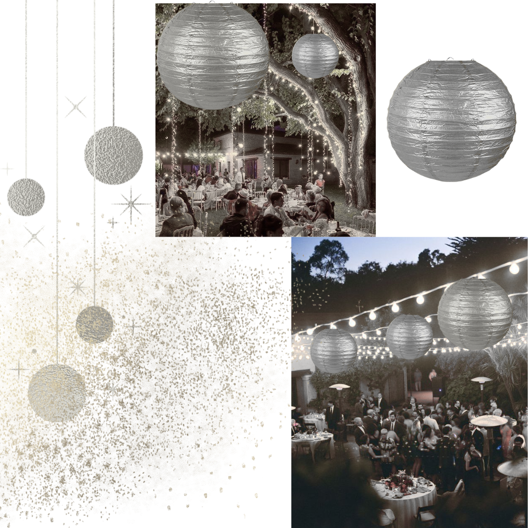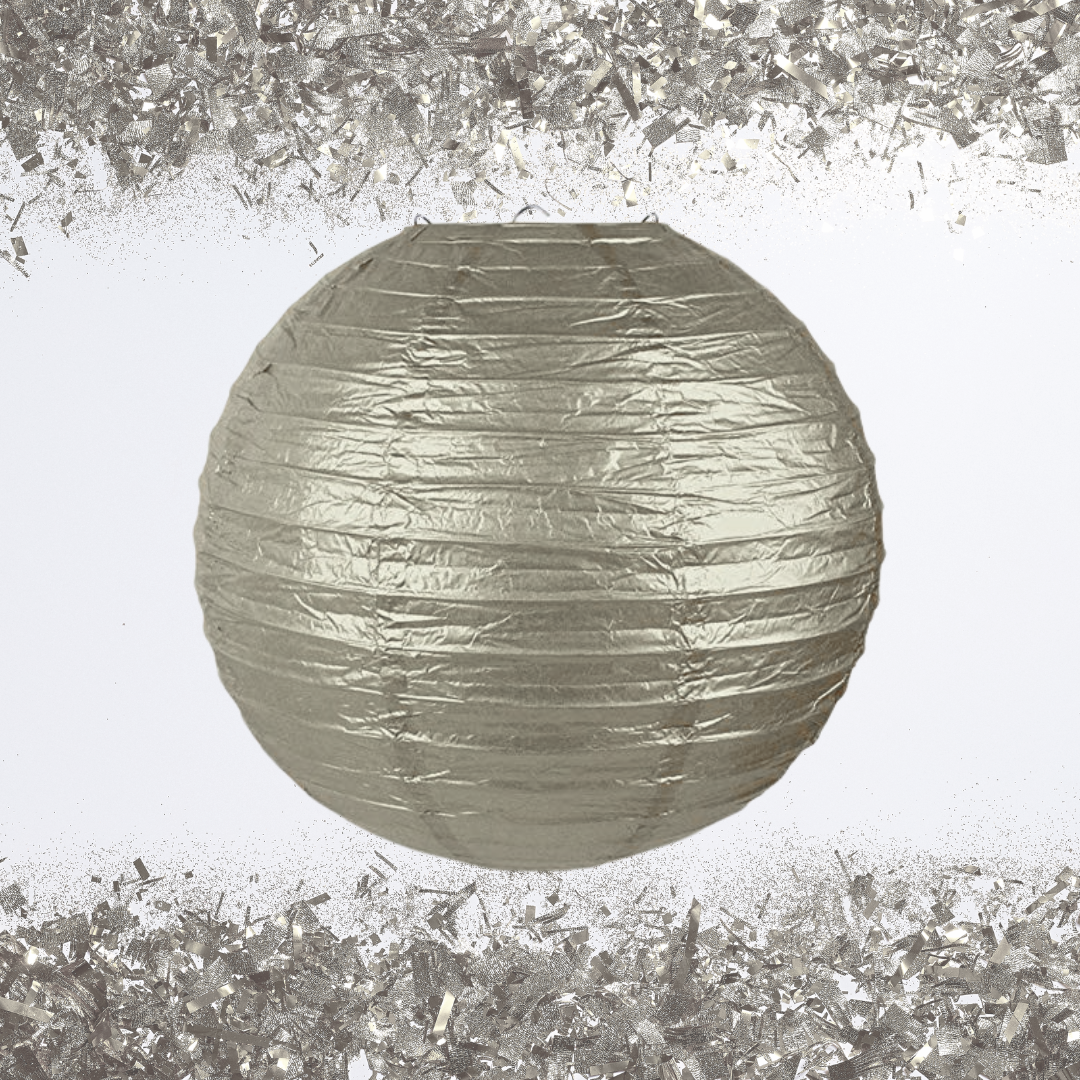 Silver Lantern: Our hand crafted round paper lanterns add an elegant atmosphere to any indoor room or outdoor party event. Great for birthday decorations or any other party decorations.