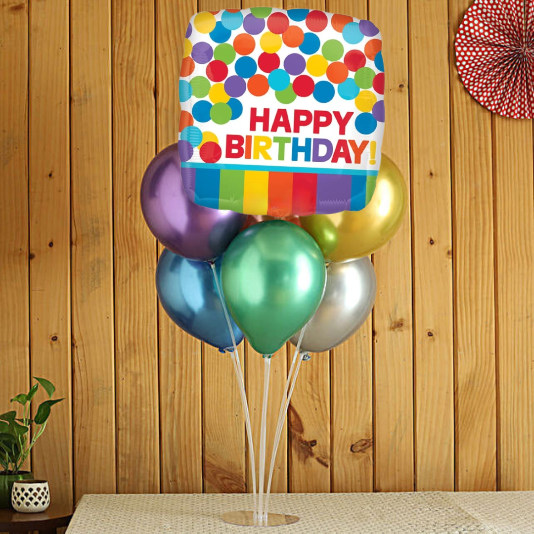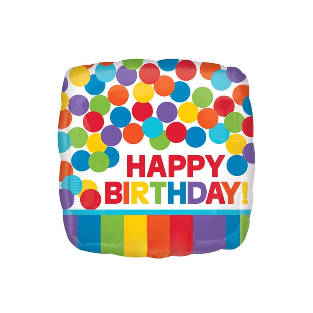 FEATURES -Adorned with a playful array of multicolor polka dots, This square-shaped balloon is a visual treat At its heart, this balloon proudly displays the words "Happy Birthday" in a cheerful font, this balloon blooms to an impressive 18 inches