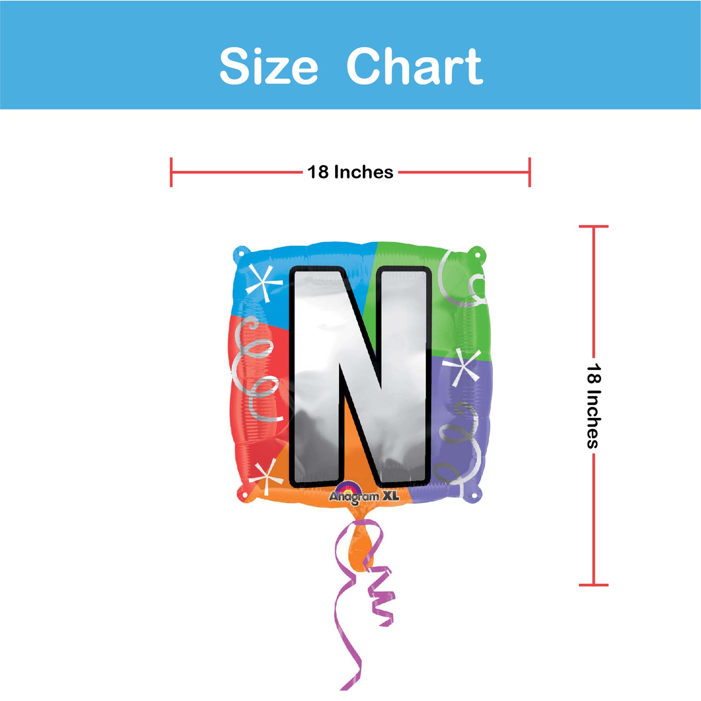 DESIGN:Lit the party spirit high with this elegant square-shaped N letter balloon. Chic design featuring "N" letter in shiny silver over a bright multicolored background. Perfect for any letter completion, create fun names using other letter balloons.