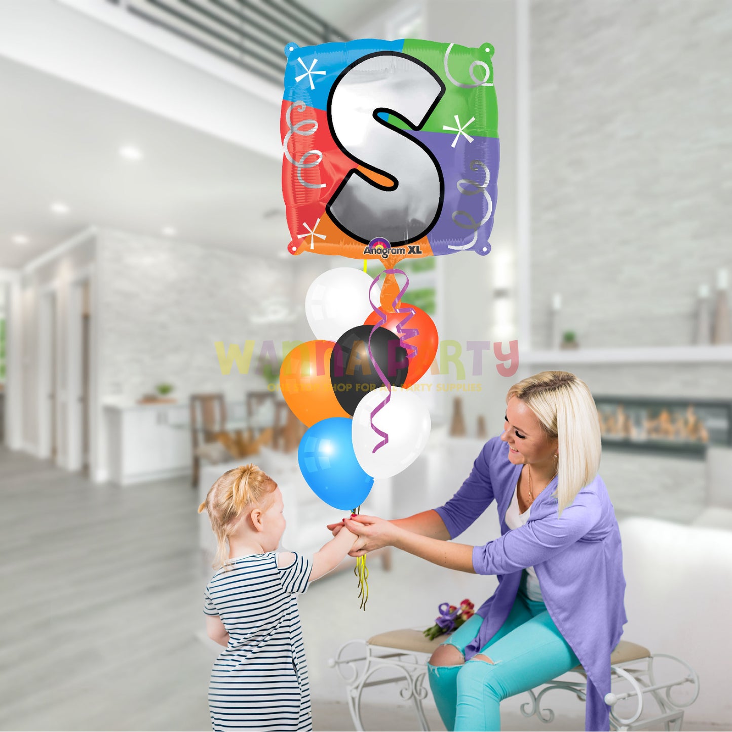 FEATURES- The balloon showcases four distinct colors, creating a visually dynamic effect. The letter S takes center stage, standing at an impressive 18 inches in height after inflation, This balloon defies convention with its square shape, setting it apart from ordinary balloons