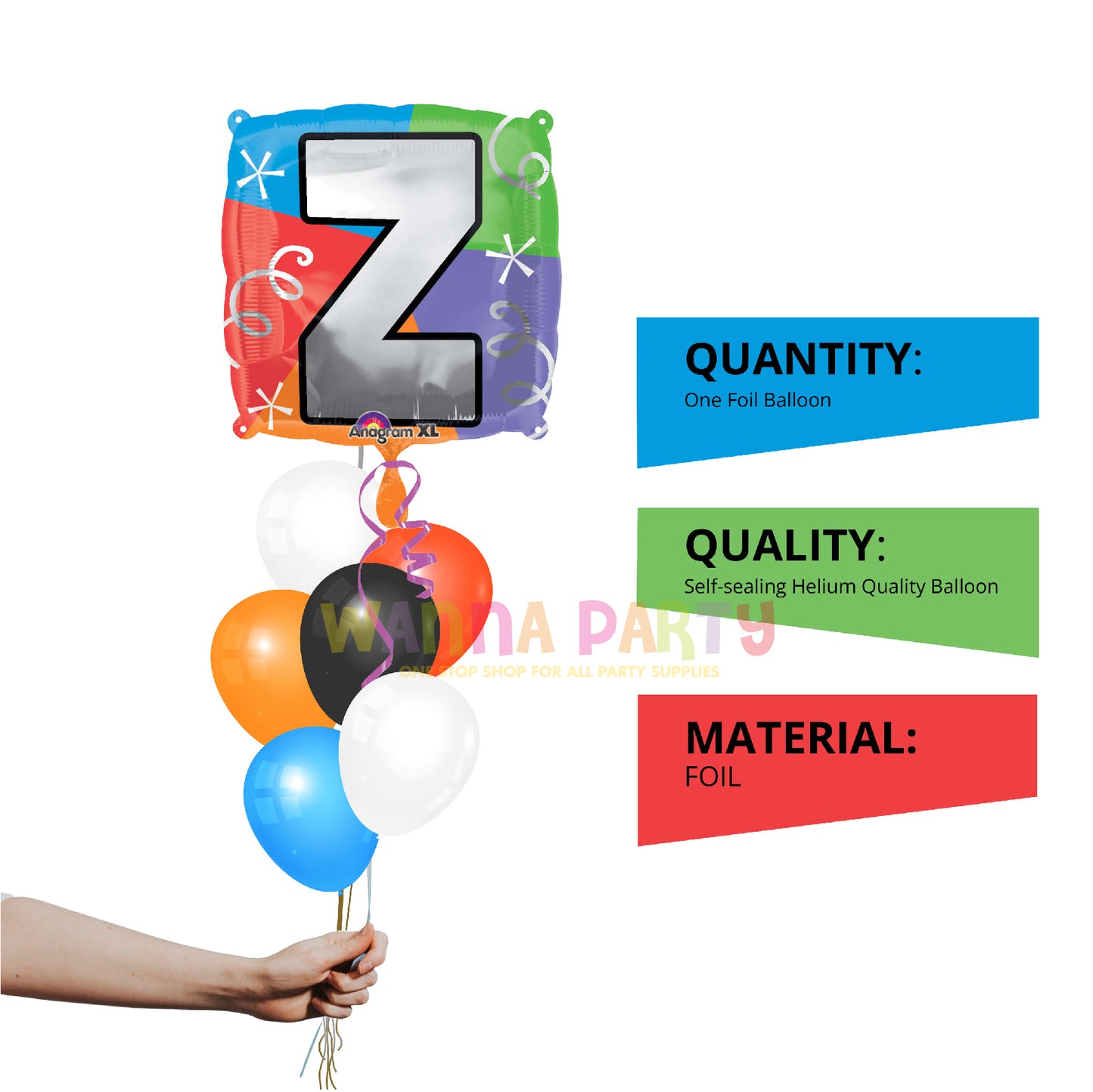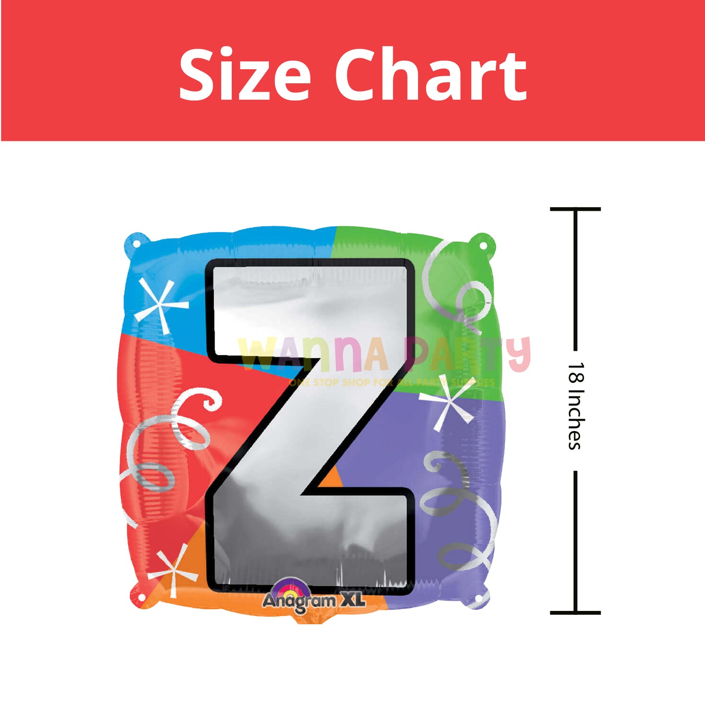DESIGN :Lit the party spirit high with this elegant square-shaped Z-letter balloon. Chic design featuring "Z" letter in shiny silver over a bright multicolored background. Perfect for any letter completion, create fun names using other letter balloons.