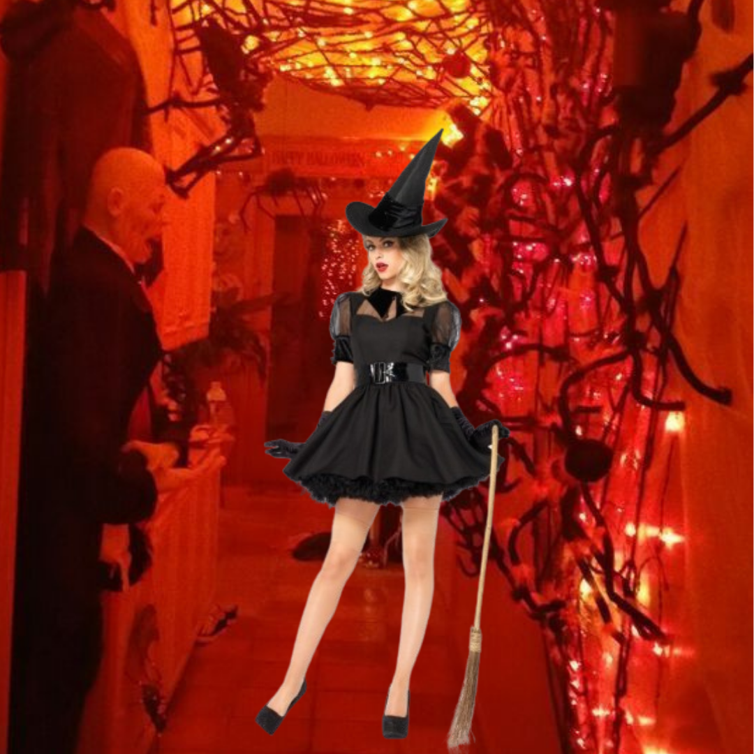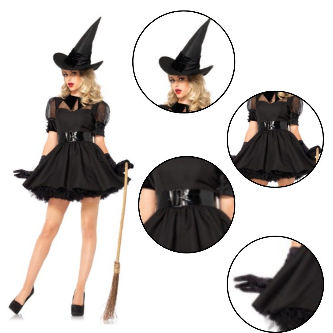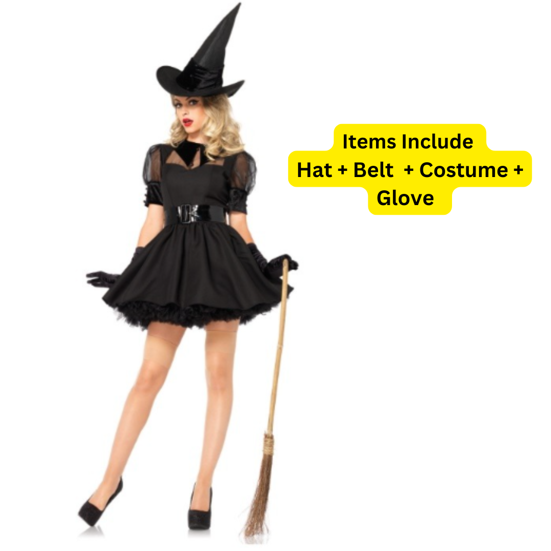 Classic Witch-Inspired Design – This Halloween costume set includes a short black dress, pointed witch hat, matching gloves, and a glossy black belt to create a bold and enchanting witch look.