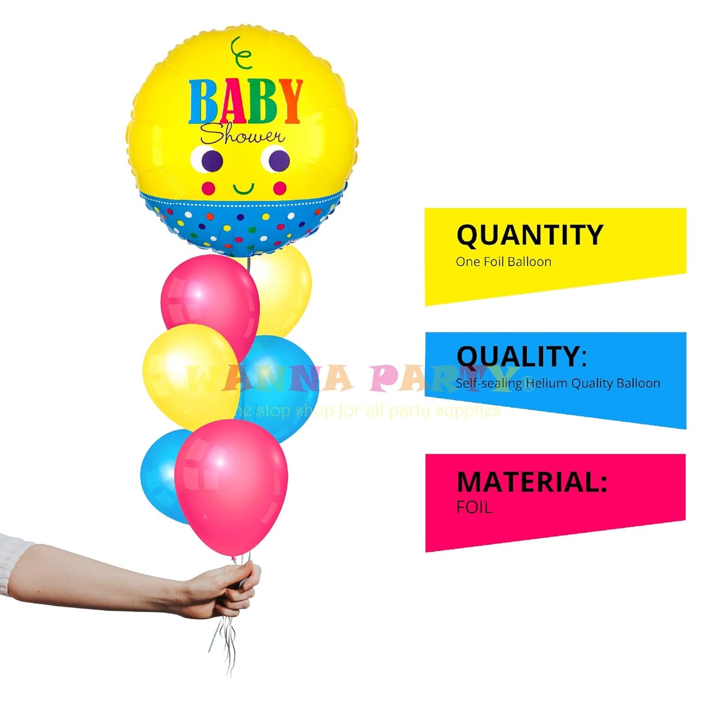 BEAUTIFUL DESIGN: This baby face baby shower balloon features a charming design that showcases the face of a cute little baby in a playful manner in yellow and blue color. "BABY Shower" in multicolor is printed on it. The balloon is suitable for both baby boys and girls.