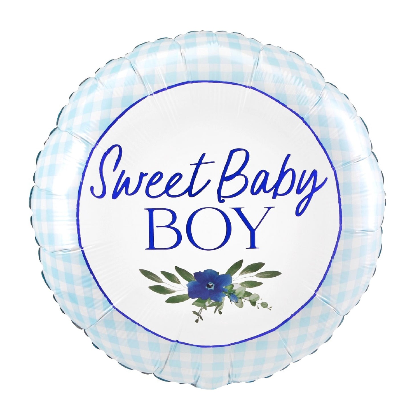 CELEBRATE IN STYLE:Welcome your cute little baby boy with love & this Baby in Bloom Sweet Boy Balloon 18". An amazing choice of sky blue & white checks over the border & Sweet Baby Boy written in dark blue on a white background.
