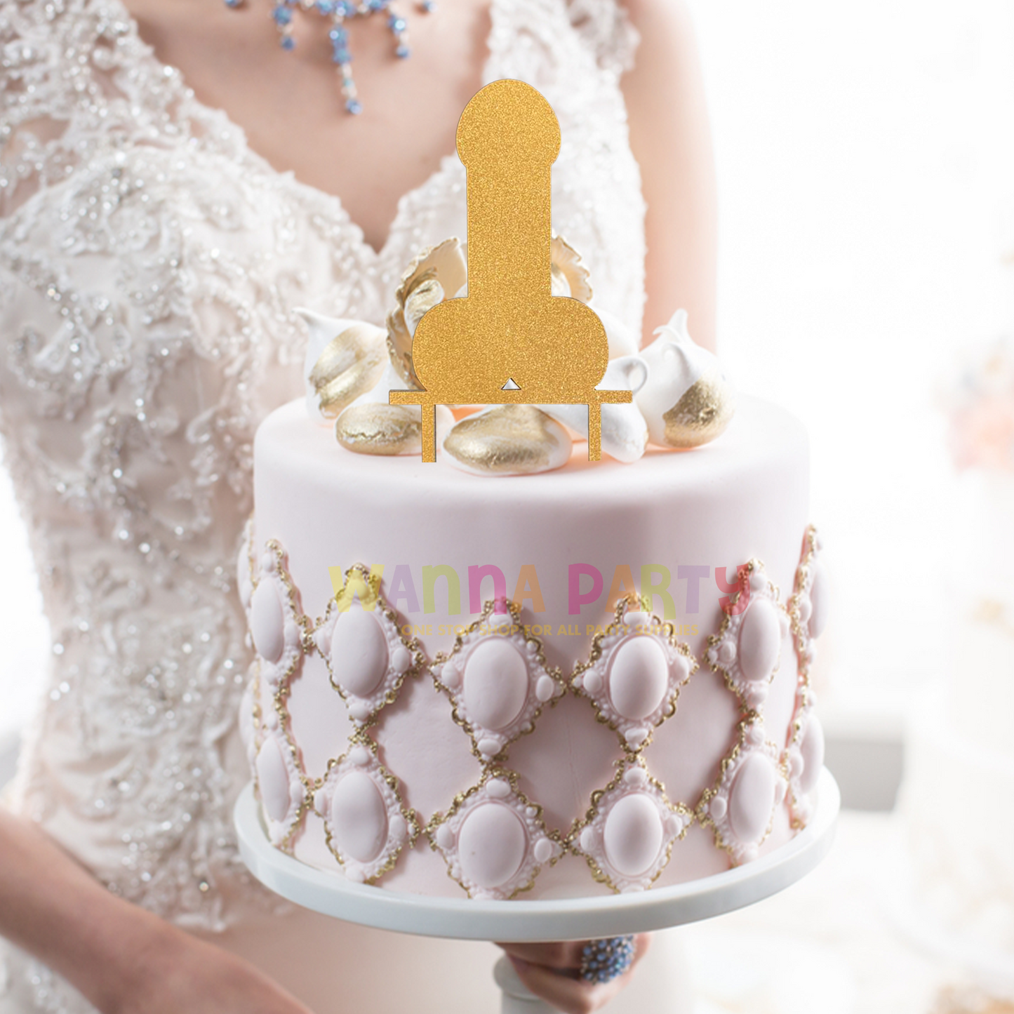 A fun and quirky bachelorette party willy shaped cake topper is a decorative piece that can be placed on the top of a cake. Comes covered in golden glittery finish and will sure enhance the quirkiness with its appearance and fit the theme of the celebration.