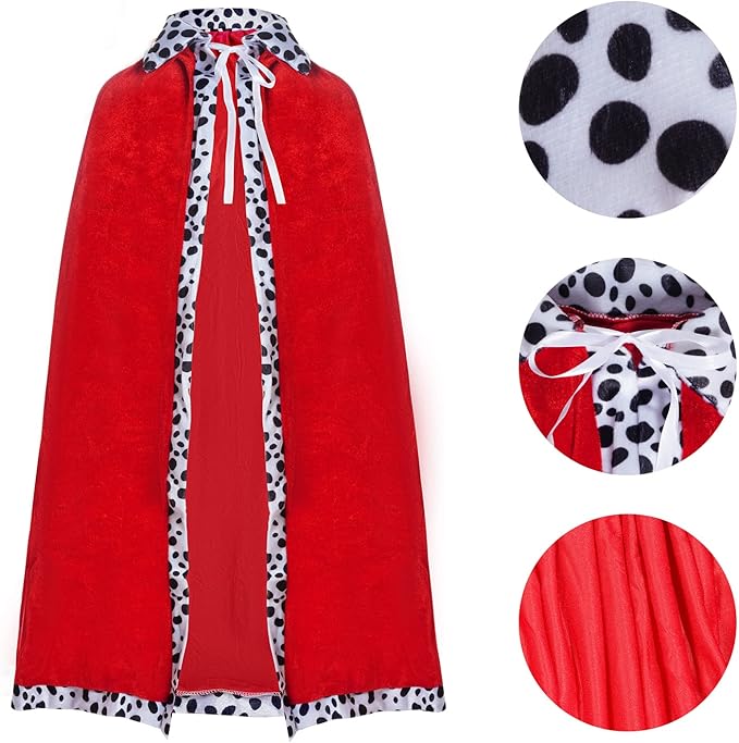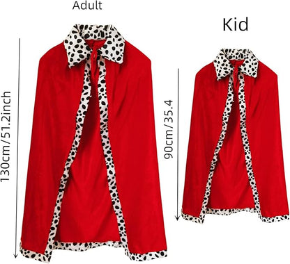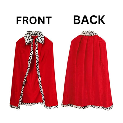 🧵 Elegant Design & Detailing: The robe features a rich red velvet finish, beautifully trimmed with classic black and white dot faux fur along the edges and collar, adding a traditional royal touch that's both striking and authentic.