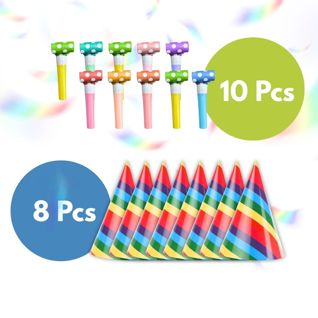 Colorful Party Combo Set: This vibrant set includes 8 rainbow-striped cone birthday hats and 10 matching polka dot blowouts, adding instant fun and festivity to any birthday party, celebration, or kids’ event.