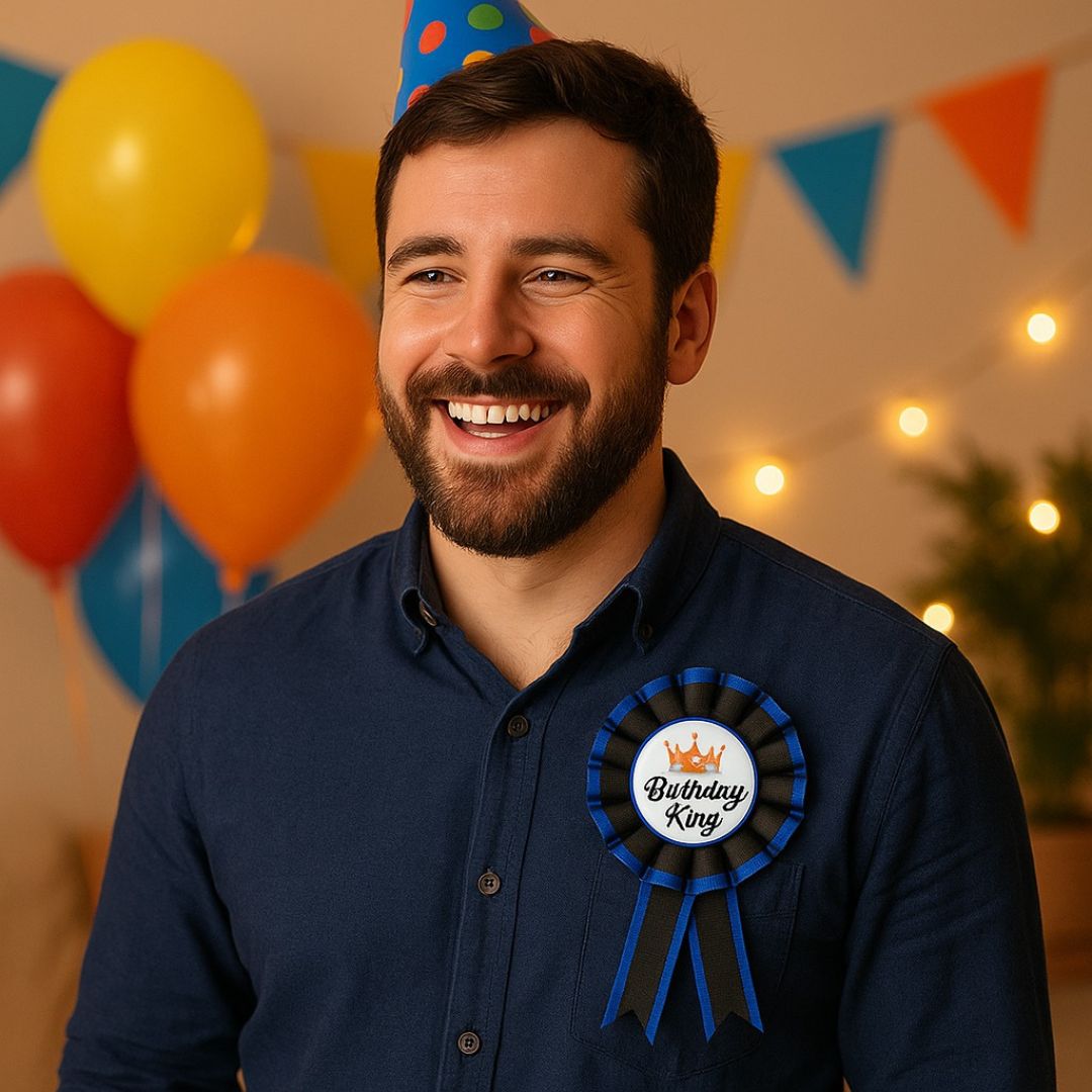 Bold & Regal Design: This "Birthday King" tinplate badge features a striking design with royal-inspired elements like a crown graphic, bold lettering, and a vibrant ribbon. It’s the perfect way to make any birthday boy or man feel like royalty on his special day.