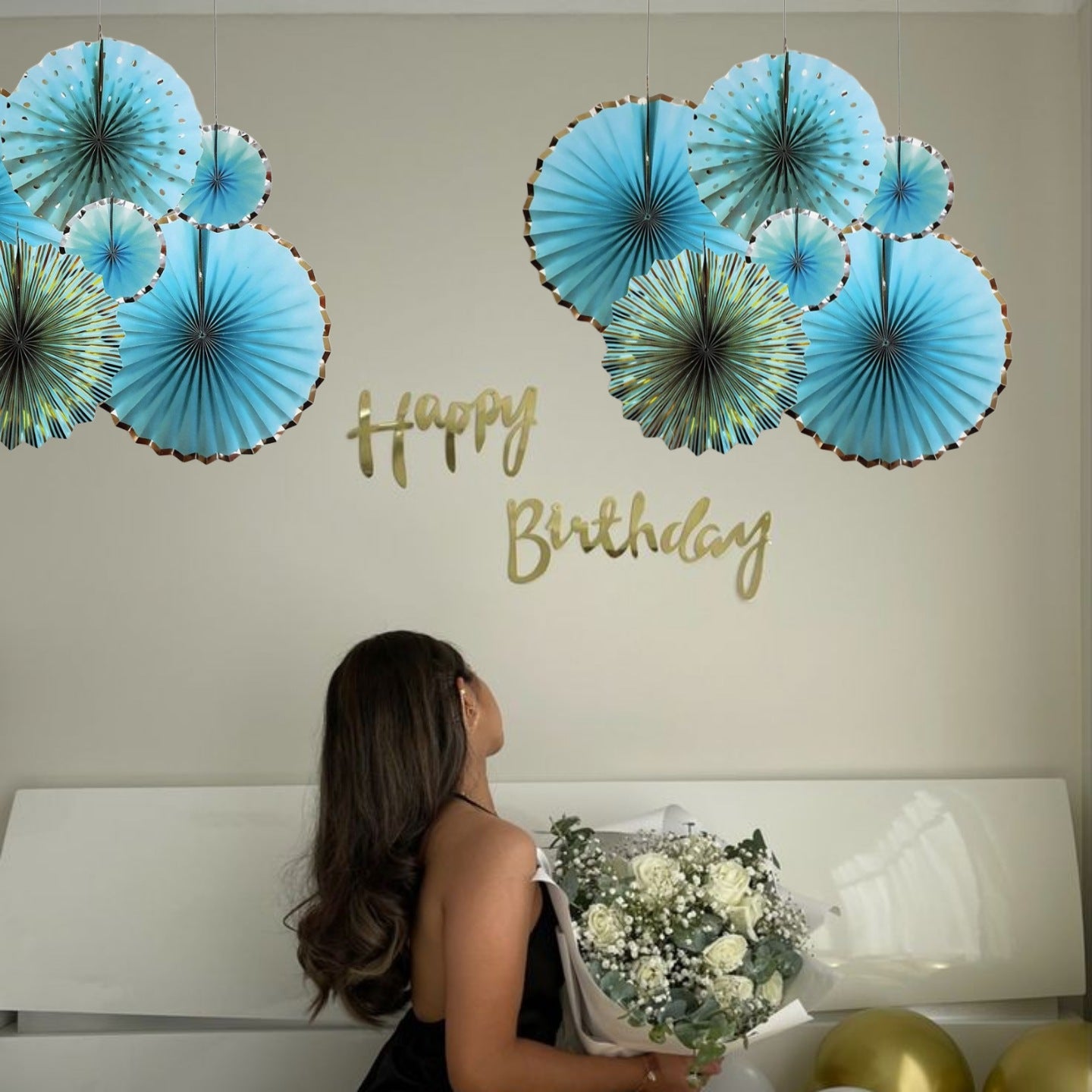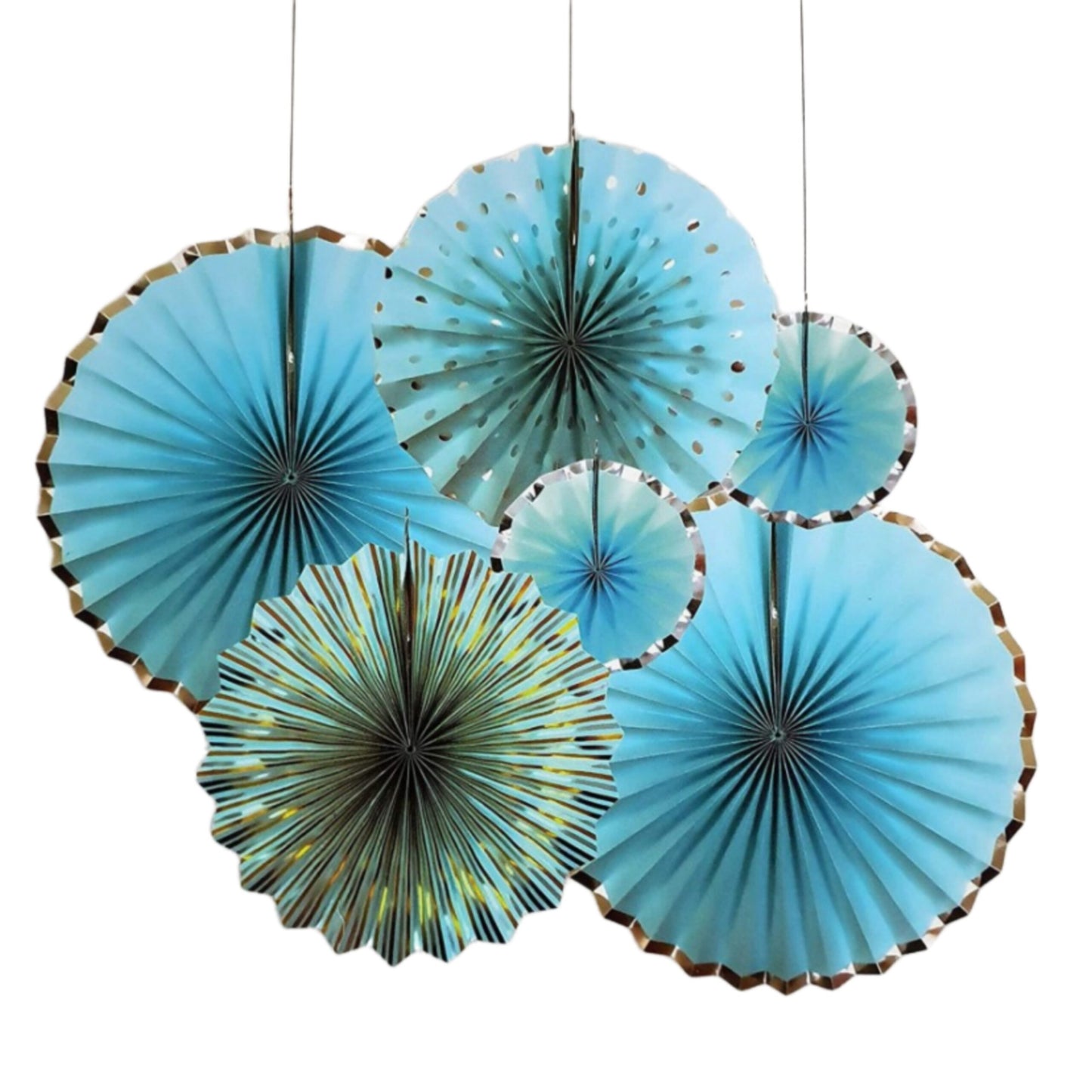 Wanna Party Blue Paper Fans With Metallic Golden Border set of 6 for Birthday Decoration Items for Boys,1st Birthday Party, Baby Boy Arrival Party/ Photo Backdrop for Cake Table Decorations