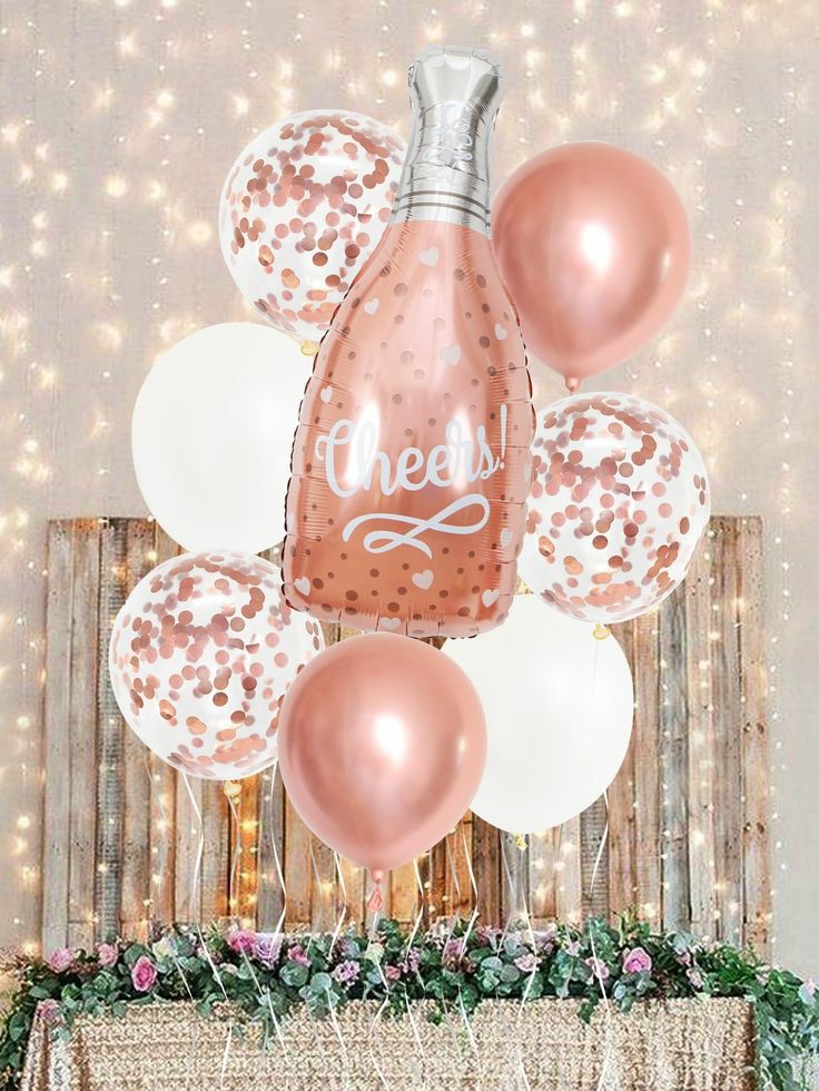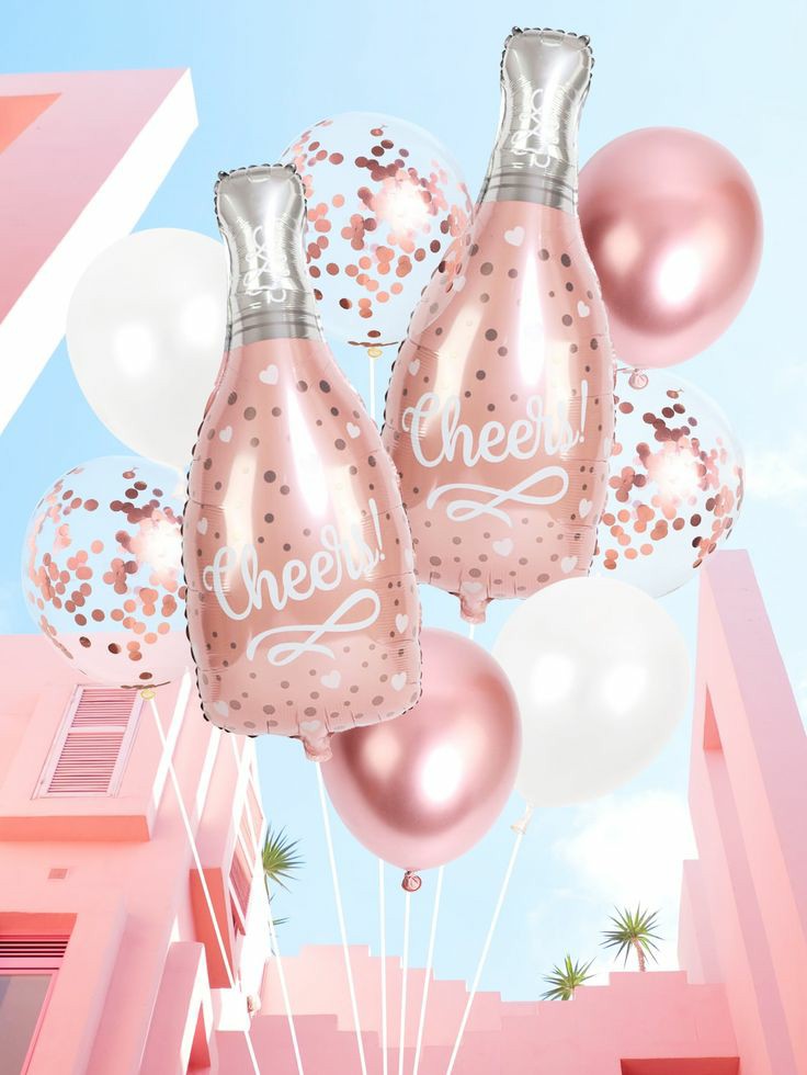 CELEBRATE IN STYLE:Accent your Valentine's Day or cocktail theme party with this Large Shape Cheers Foil Balloon. This giant inflatable, shaped like a champagne bottle, will bring a sense of enjoyment to your special events. The rose gold colored bottle with silver cork features "Cheers!" text with many hearts & glitters at the back.