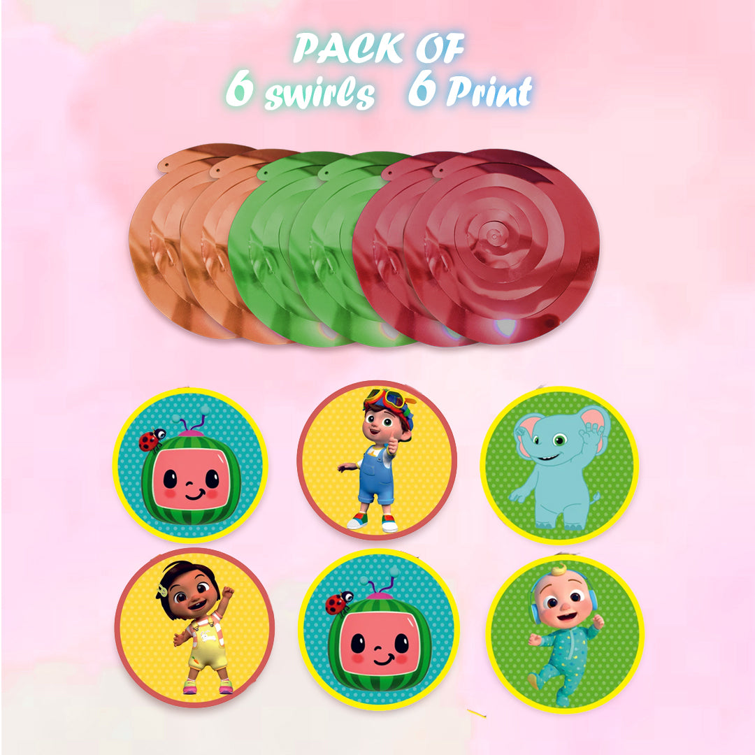 – 6 Swirls come with cutouts of Cocomelon Theme Hanging.