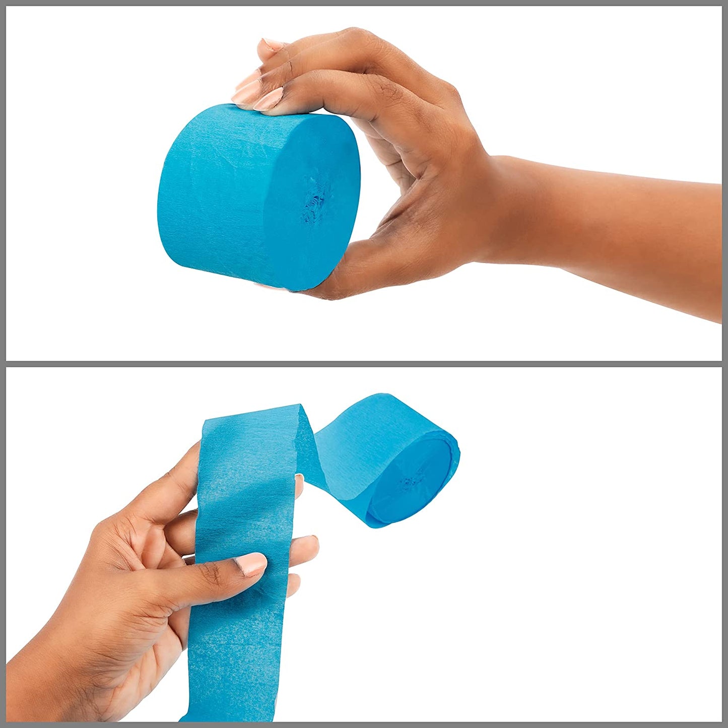 TWIST OR CURL: Hang and twist this giant roll of crepe paper all over your party room, from wall to wall and ceiling to floor. For a custom design that enhances your special event, mix and match this Caribbean Blue Streamer with solid-color and printed decorations.