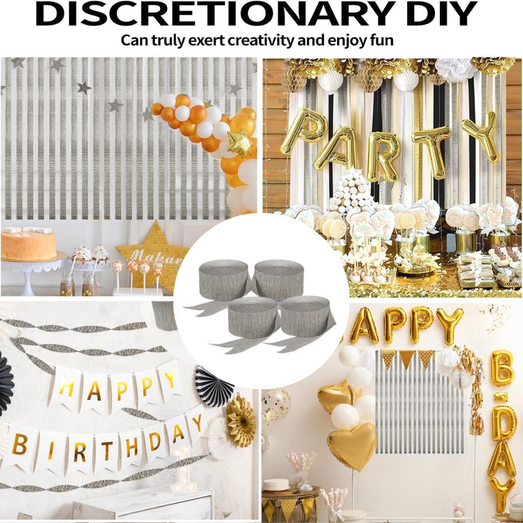 TWIST OR CURL: Hang and twist this giant roll of crepe paper all over your party room, from wall to wall and ceiling to floor. For a custom design that enhances your special event, mix and match this Silver Streamer with solid-color and printed decorations.