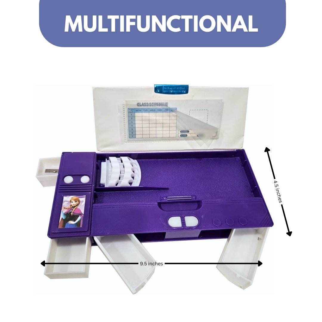 Multi-Function Compartments: Designed with multiple interactive sections, this box includes pop-out drawers, sharpeners, and compartments that open with buttons, making stationery storage fun and easy to access for children.