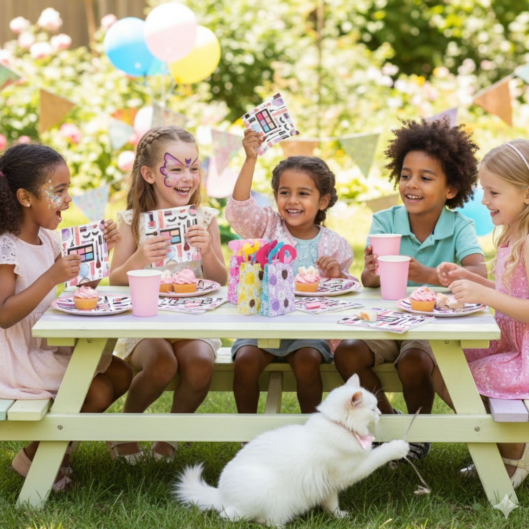 Trendy Makeup & Skincare Design: Features stylish illustrations of lipstick, nail polish, perfume bottles, makeup brushes, and skincare items in vibrant, feminine colors — ideal for girls’ birthdays and beauty-themed celebrations.