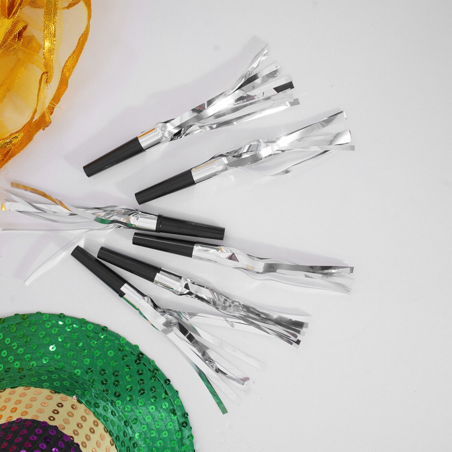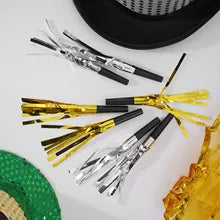 Joyful Noise:Add a touch of glitz and interactive fun to your celebrations with our Foil Silver & Black Blowouts. Each blowout comes with a foil tube that unrolls to create a festive horn-like sound when blown into. It's an interactive way to engage guests of all ages and add a joyful noise to the celebration.
