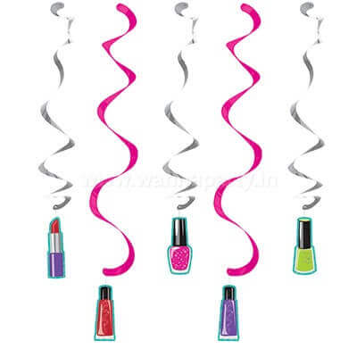 Deck out your child's special celebration in color and charm with this darling Glitzy Girl Dizzy Danglers. Fasten it across a doorway, along a banister, on a mantel or on the wall above a snack table to add a little extra oomph to your party space. These hanging decorations feature silver and pink foil swirls with lipstick cutouts attached at the end. This birthday party decoration will enhance the festivities and is sold in packs of five.
