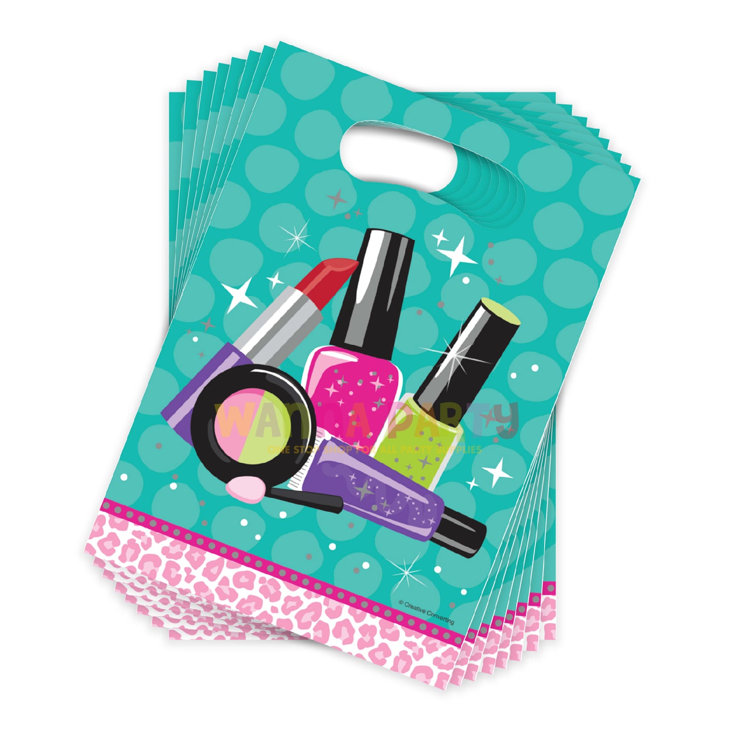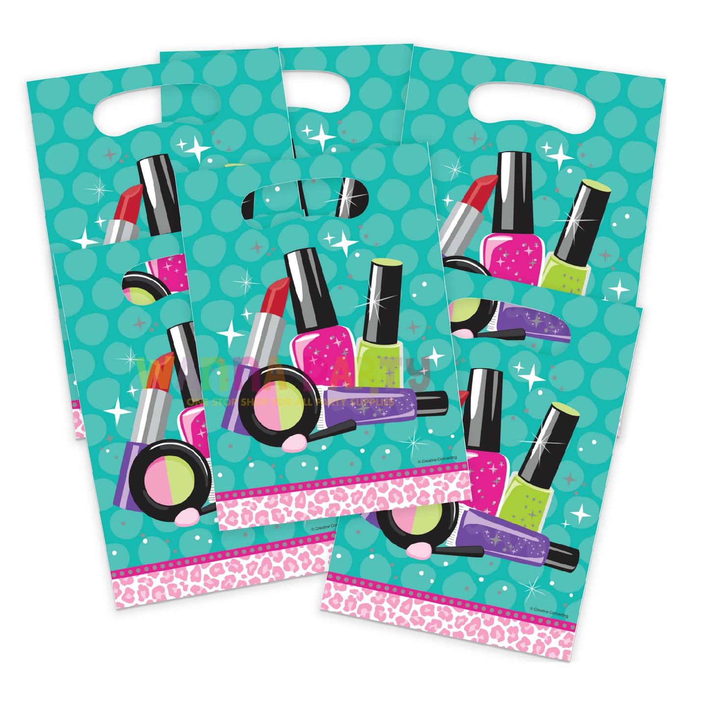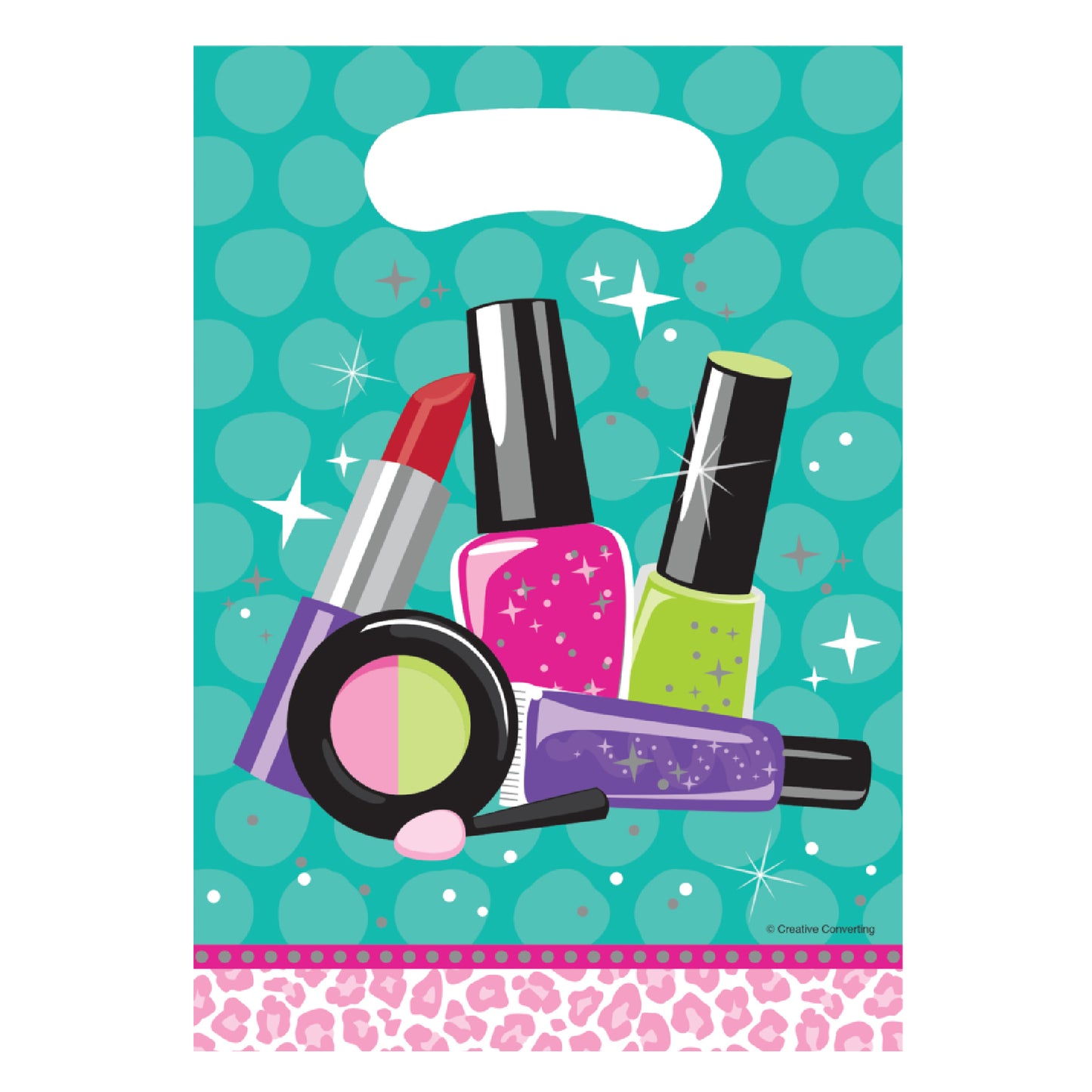 DESIGN:These teal bags feature assorted cosmetic line with a pink leopard print at the bottom. The party bags have handles that are perfect size for kids to grip.