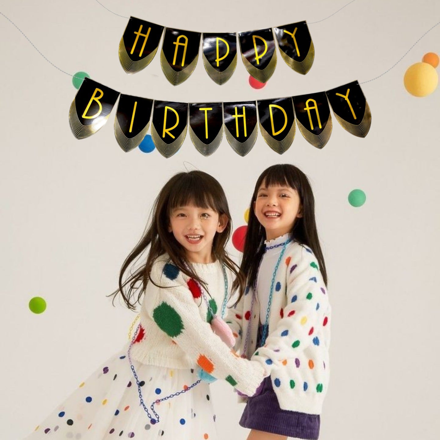 Wanna Party Beautiful Elegant Happy Birthday Banner Black & Gold on Thick Cardstock Paper/Black Happy Birthday Bunting Garland for Birthday Photo Booth and Backdrop for Birthday Party Decorations