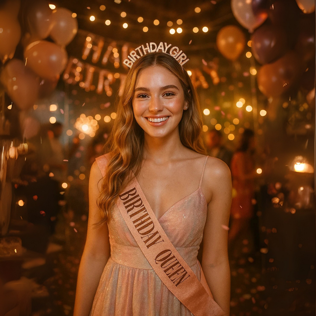 ✨ Coordinated Glam Look: The headband and sash are perfectly color-matched in shimmering rose gold, creating a stylish and photo-ready birthday look. Ideal for all ages, the set pairs effortlessly with any outfit—casual or dressy.