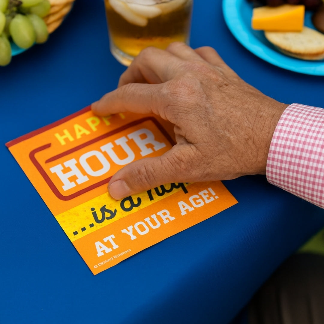 Fun & Quirky Design: Add a playful twist to your party with these bright orange beverage napkins featuring the humorous quote “Happy Hour… is a nap at your age!” — guaranteed to get your guests smiling and start conversations.