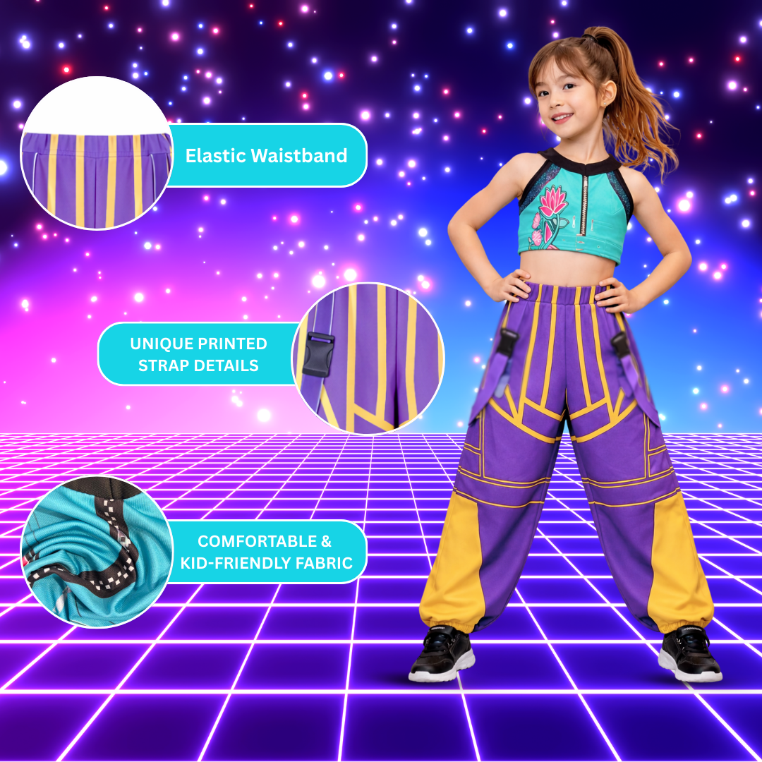 Trendy Idol-Inspired Outfit Set – Stylish green and purple themed costume designed for girls who love K-pop and performance fashion. Includes a coordinated crop top and statement pants that create a bold and energetic stage look
