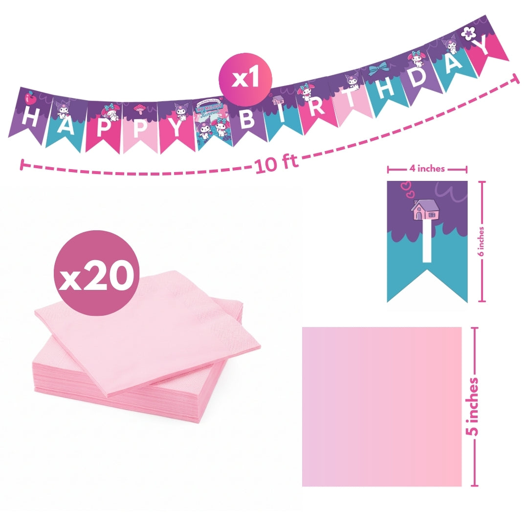 🎉 Perfect for Girls’ Parties – Ideal for birthday parties, anime-themed celebrations, or My Melody gatherings, this set instantly transforms your space into a playful Kuromi-themed party zone.
