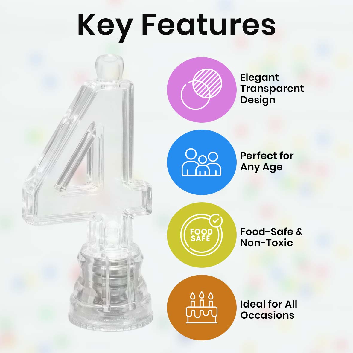 Elegant Transparent Design: The Transparent Candle No. 4 features a clean, crystal-clear finish that blends beautifully with any cake theme. Its minimal yet stylish look adds a modern touch to birthday cakes without overpowering the decoration.