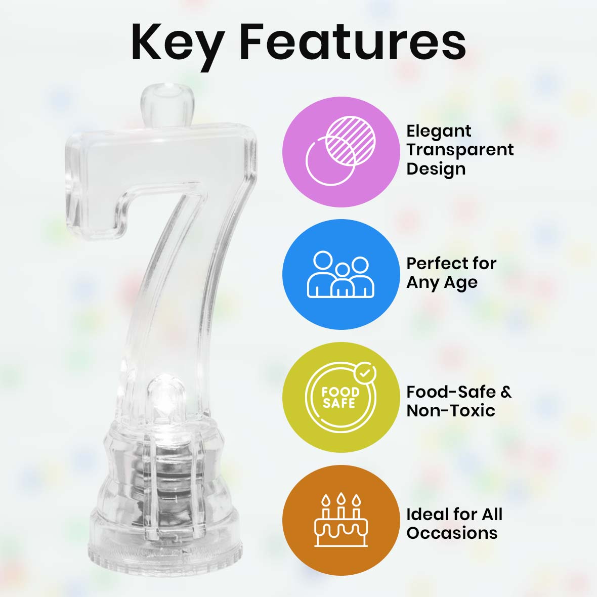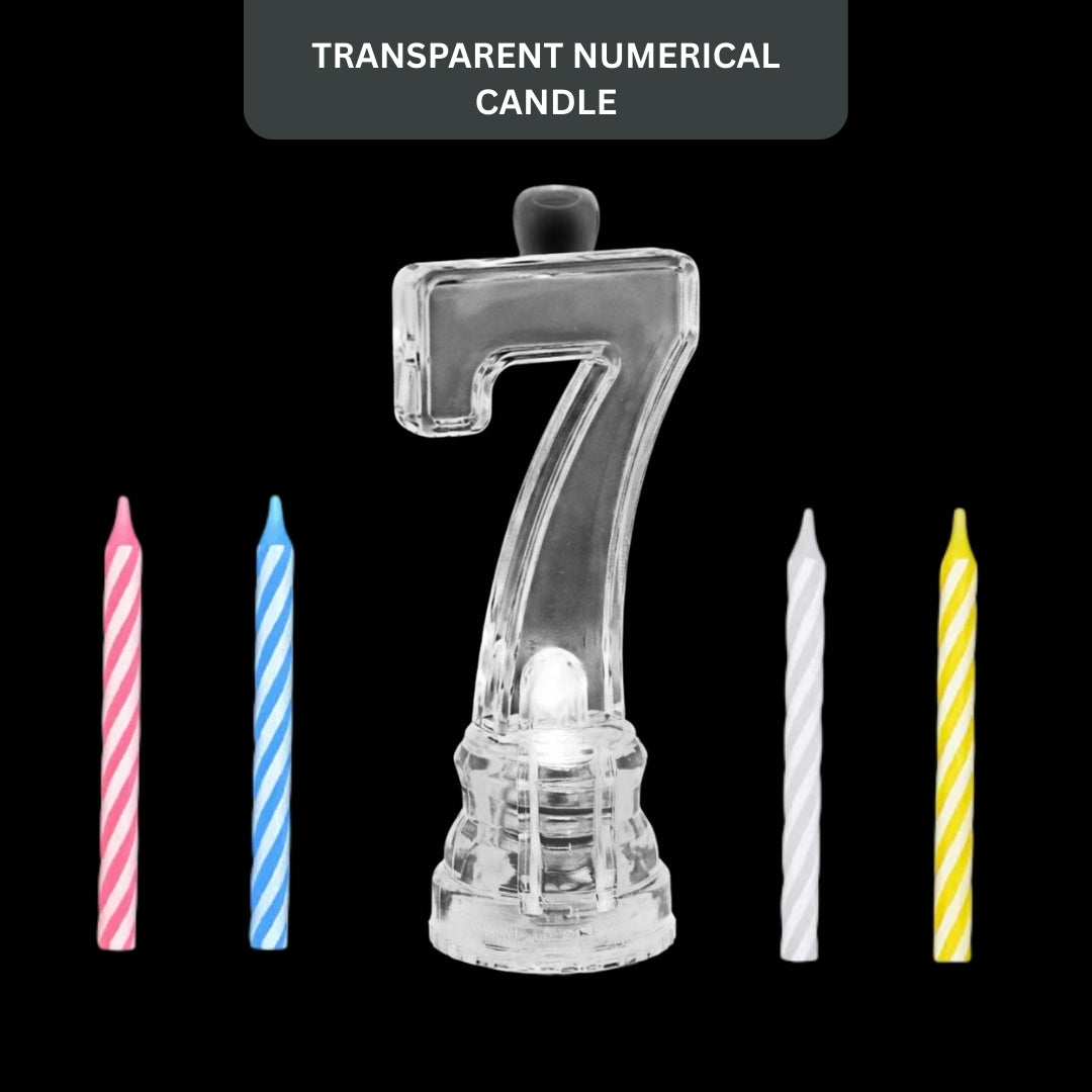 Elegant Transparent Design: The Transparent Candle No. 7 features a clean, crystal-clear finish that blends beautifully with any cake theme. Its minimal yet stylish look adds a modern touch to birthday cakes without overpowering the decoration.