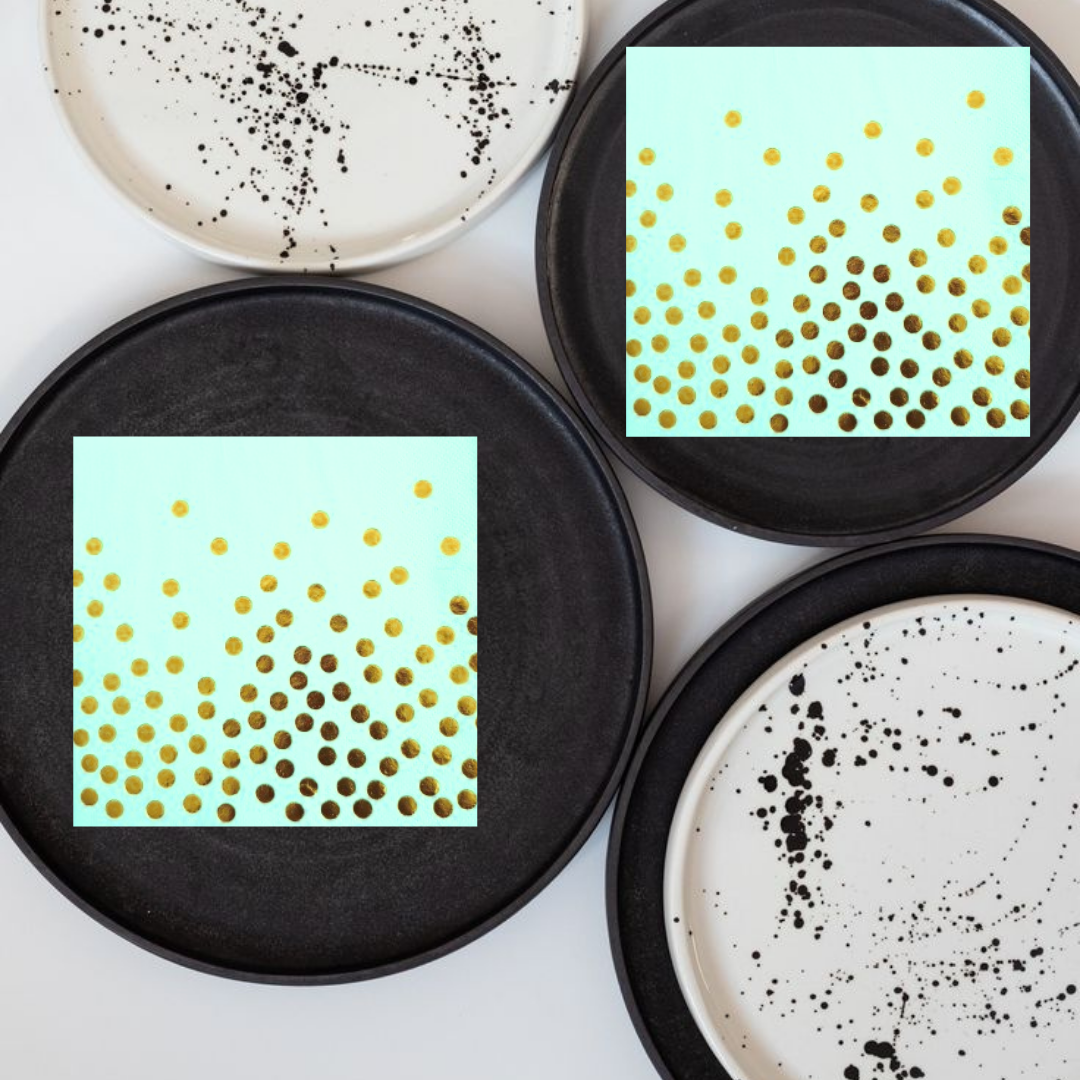Charming Design:Light Blue & Gold Polka Dot Napkins - 20PC . Add a touch of shimmering elegance to your celebrations with these Light Blue Paper Napkins featuring Golden Polka Dots - the perfect blend of style and functionality.