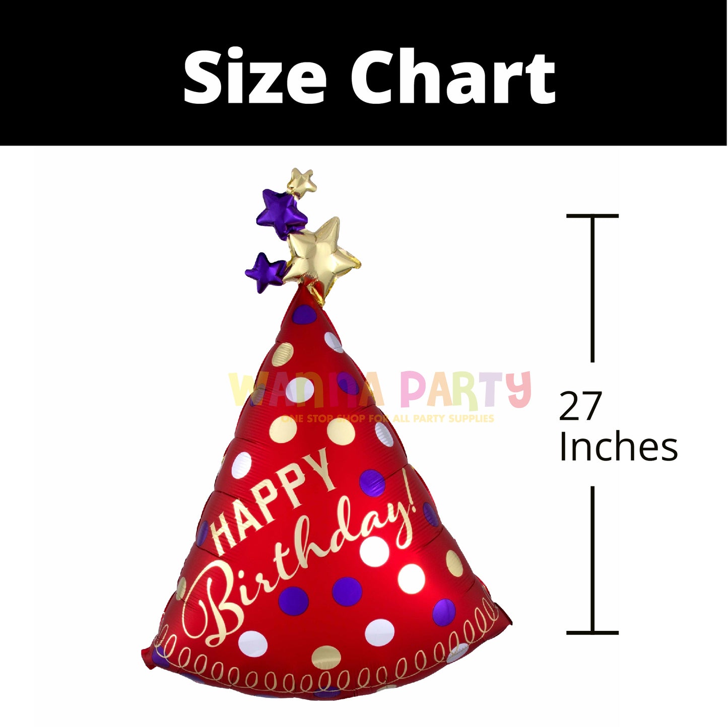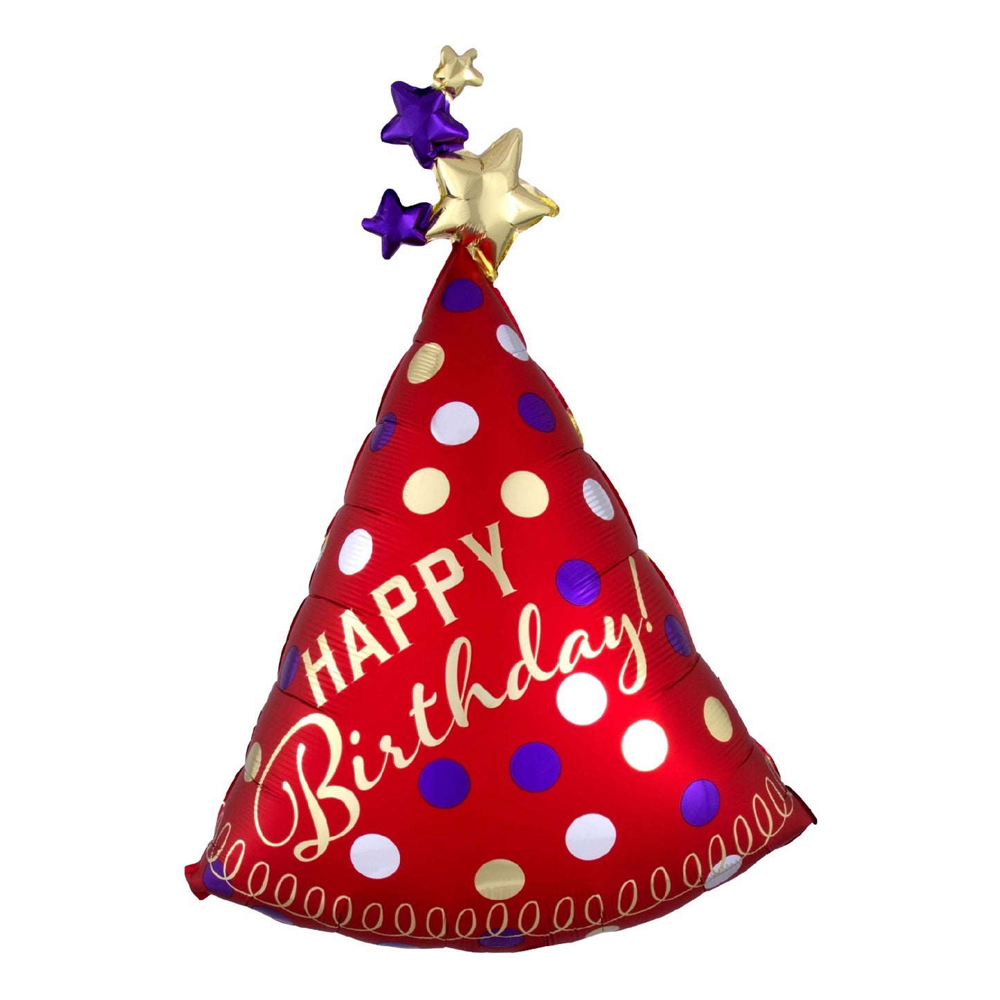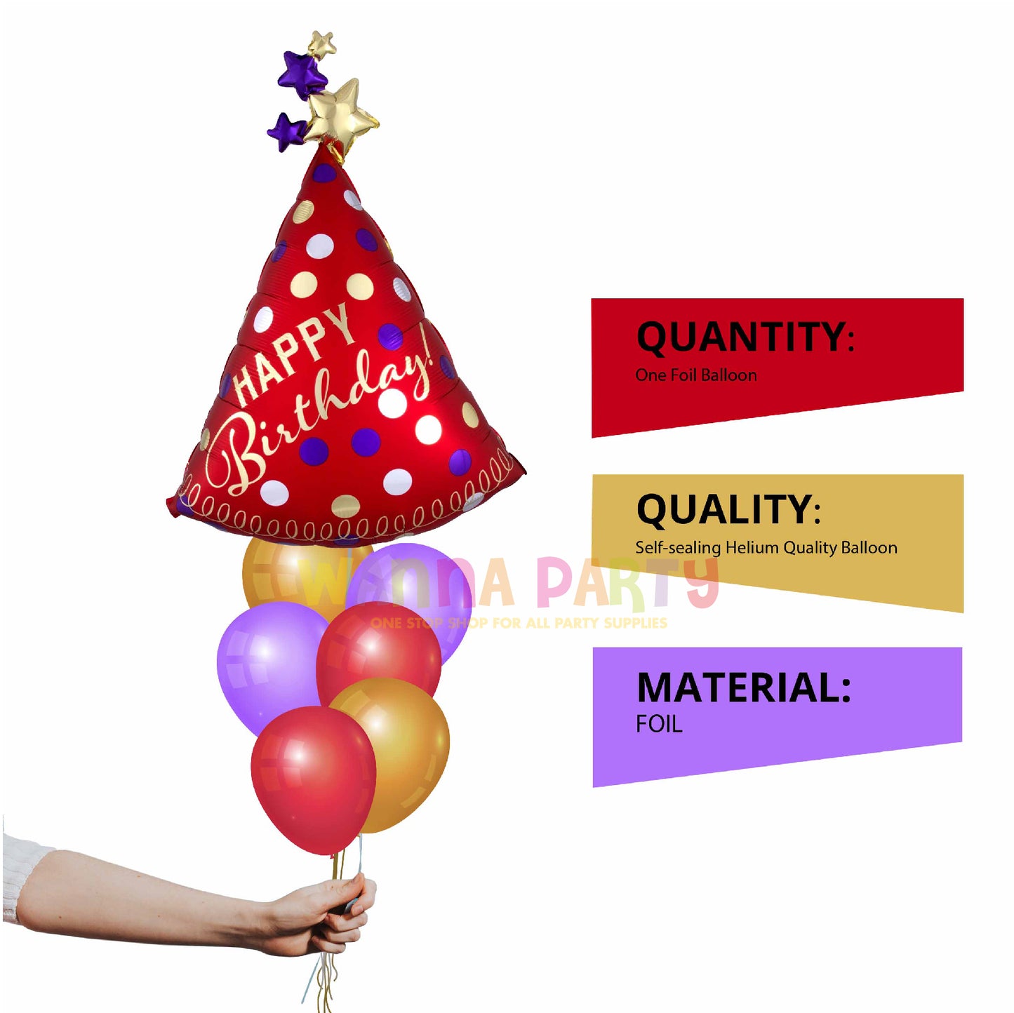 CELEBRATE IN STYLE:Celebrate that special someone's birthday with this large hat shape Red Satin Party Hat foil balloon. Featuring a satin red party hat with polka dots & a "Happy Birthday" headline in golden. Fancy different-shaped stars are attached at the top of the foil balloon.
