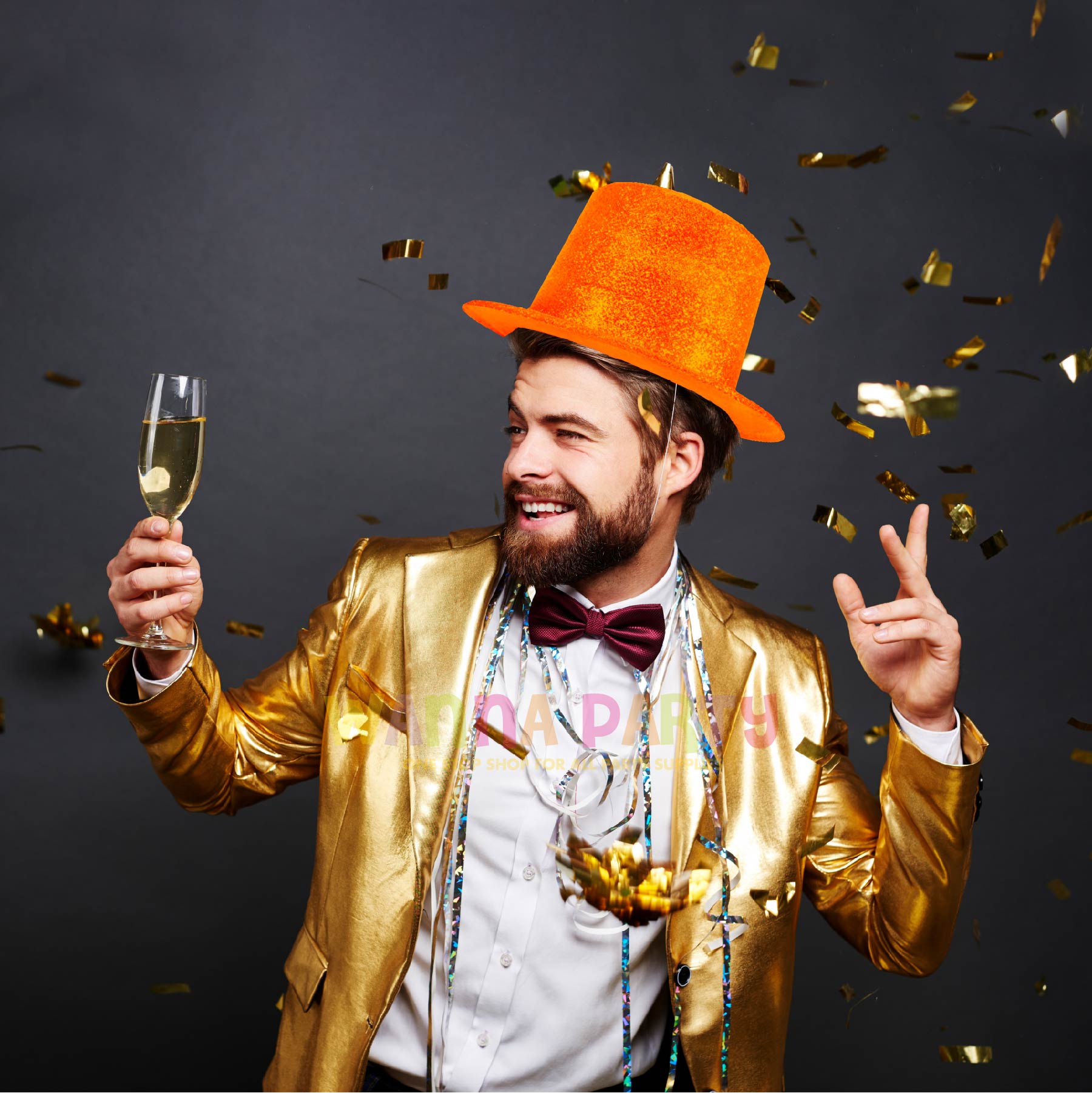 Bold Neon Orange with Glitter Finish: Stand out at any party or event with this vibrant neon orange fedora hat, covered in shimmering glitter for an eye-catching, glamorous look that turns heads.