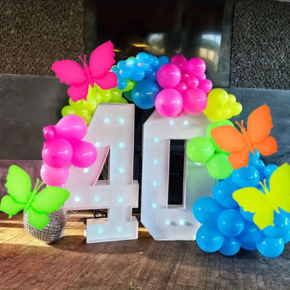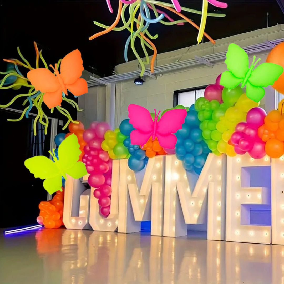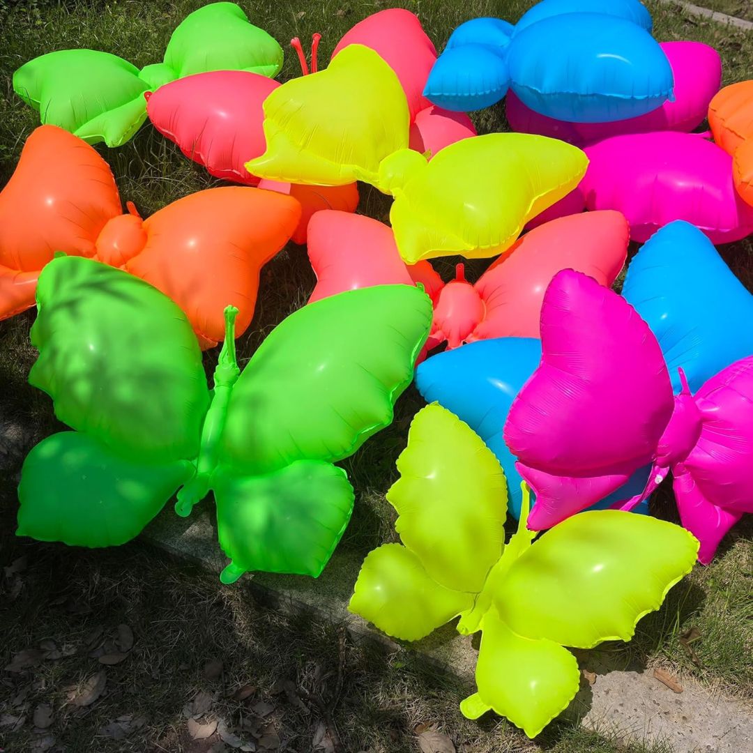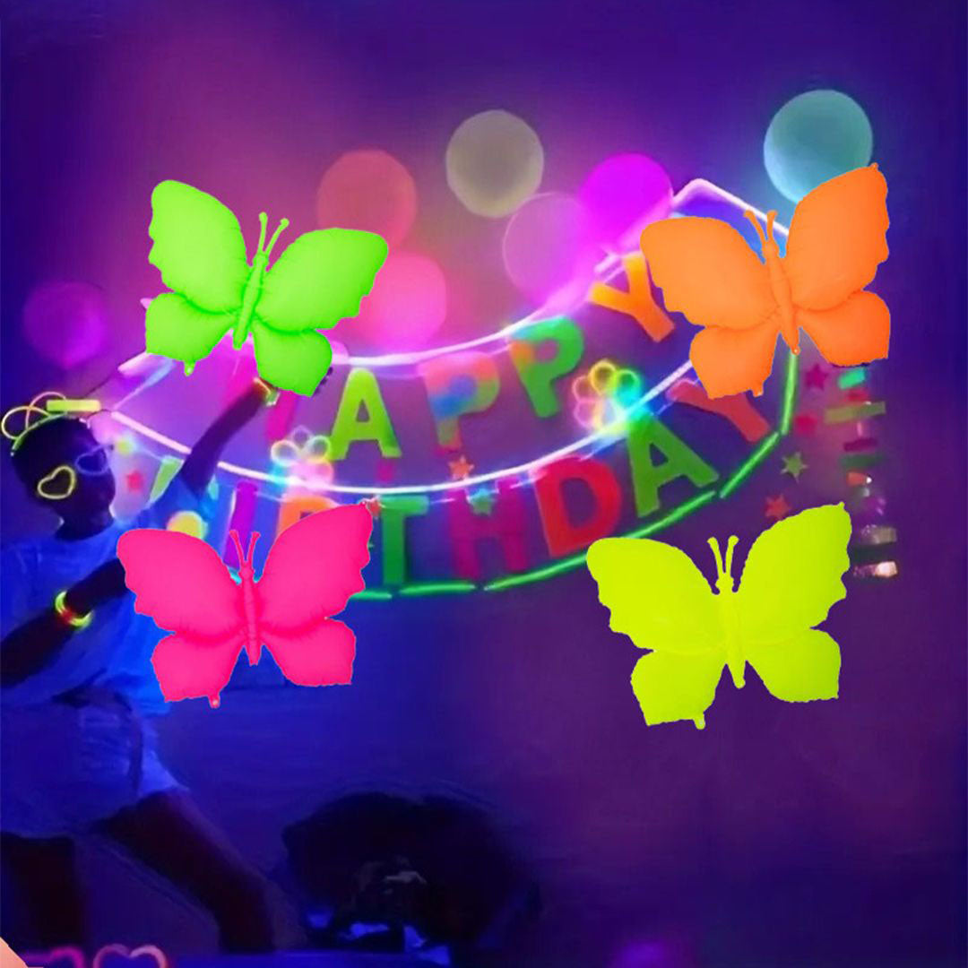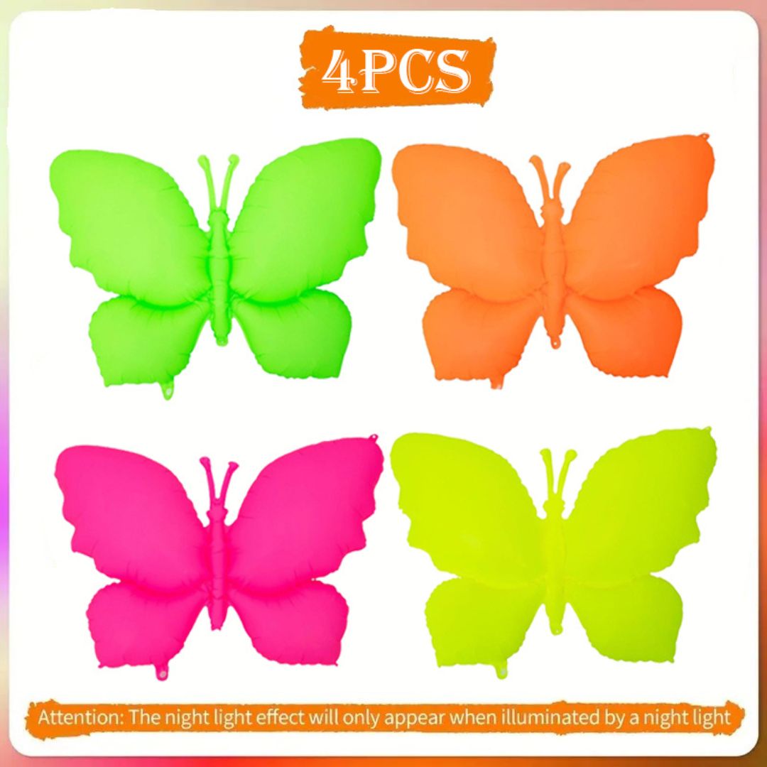 Set of 4 Vibrant Butterfly Balloons: This pack includes four eye-catching 18-inch butterfly-shaped foil balloons, each designed in bright neon and UV-reactive colors that pop under blacklight, adding a fun glow effect to your party space.
