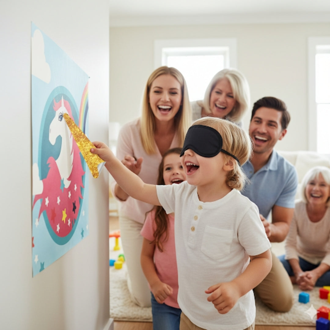 Complete Game Set: Includes 1 large, vibrant unicorn poster, 24 colorful horn stickers, and 1 soft blindfold, ensuring everyone can join the fun, from kids to adults.