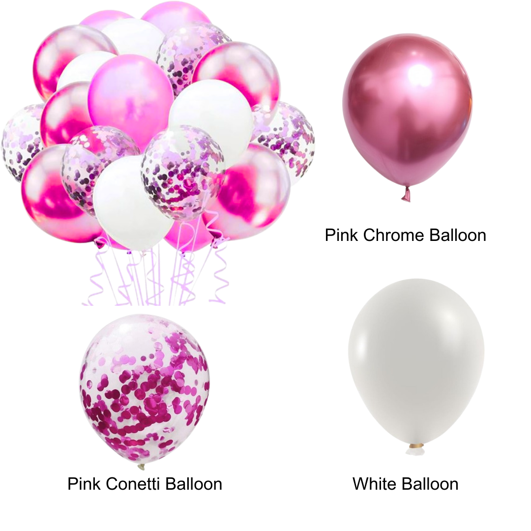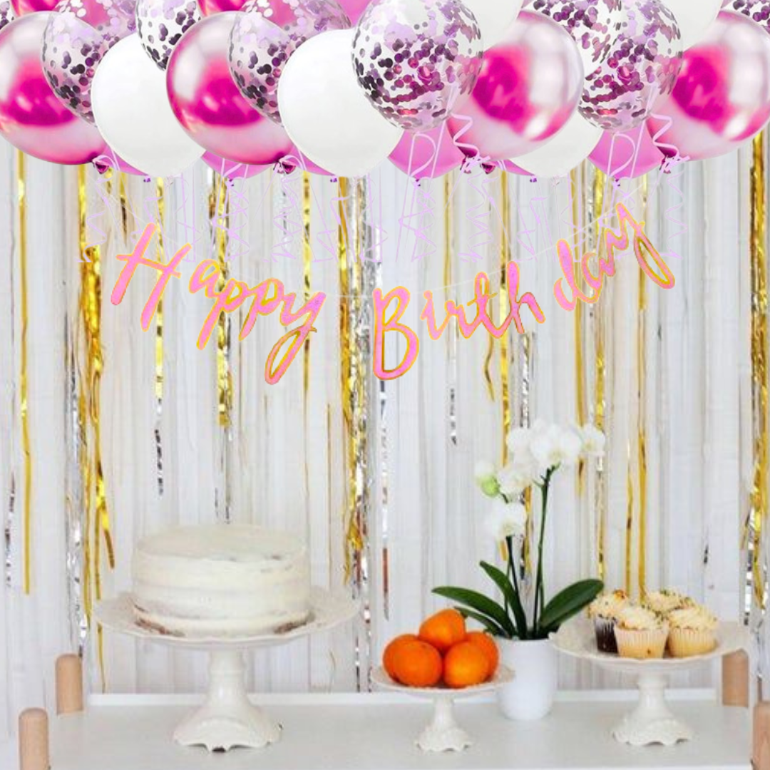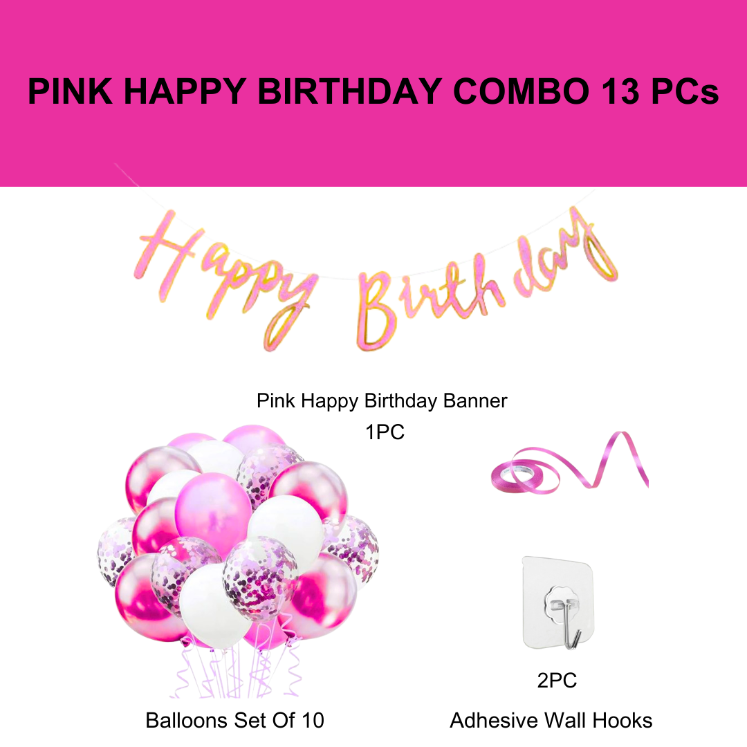 Hot Pink Happy Birthday Cursive Banner w/ White & Pink Confetti Balloons and Wall Hooks Birthday Combo - Set of 13PC