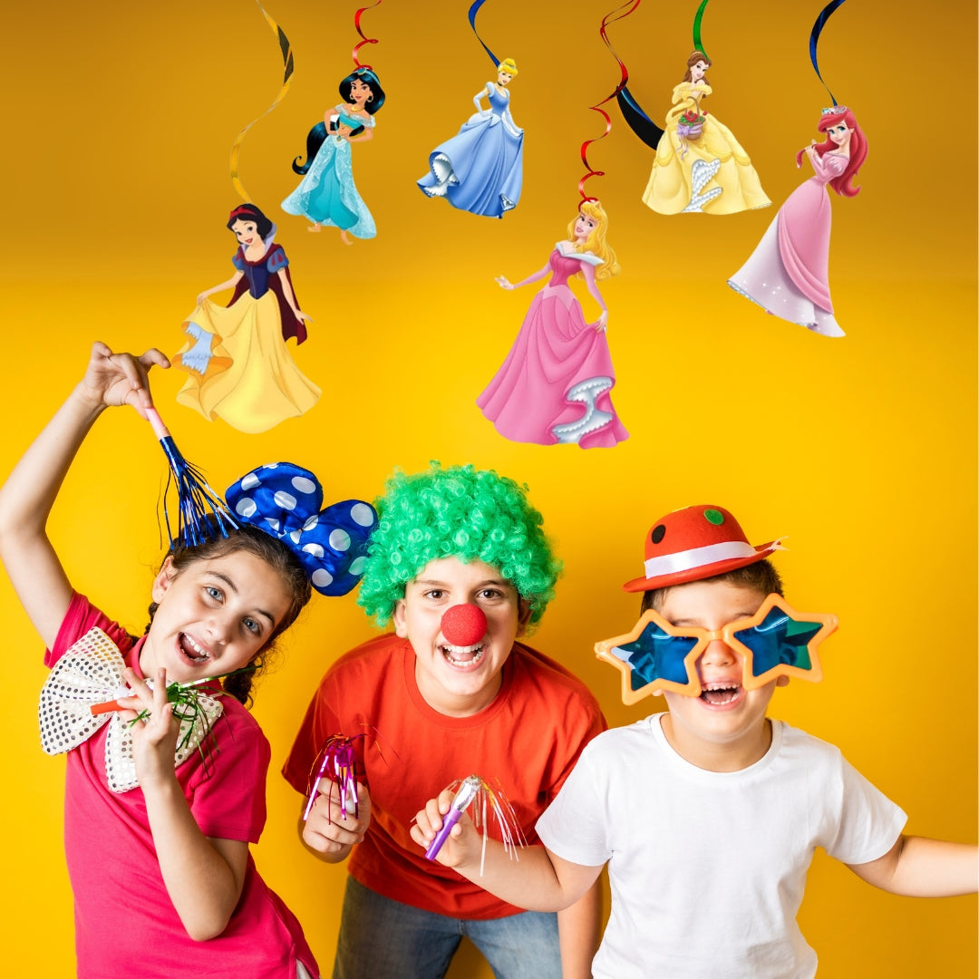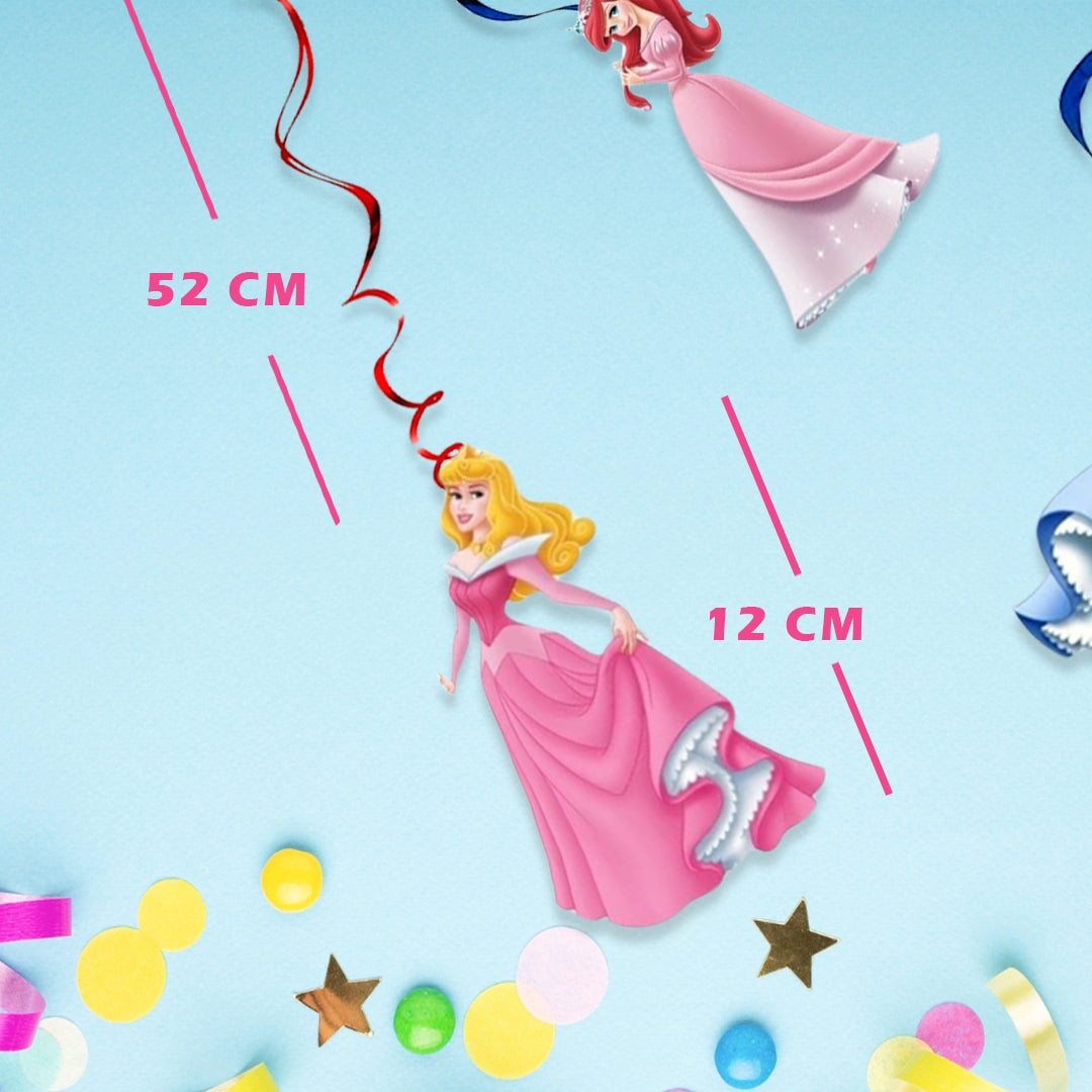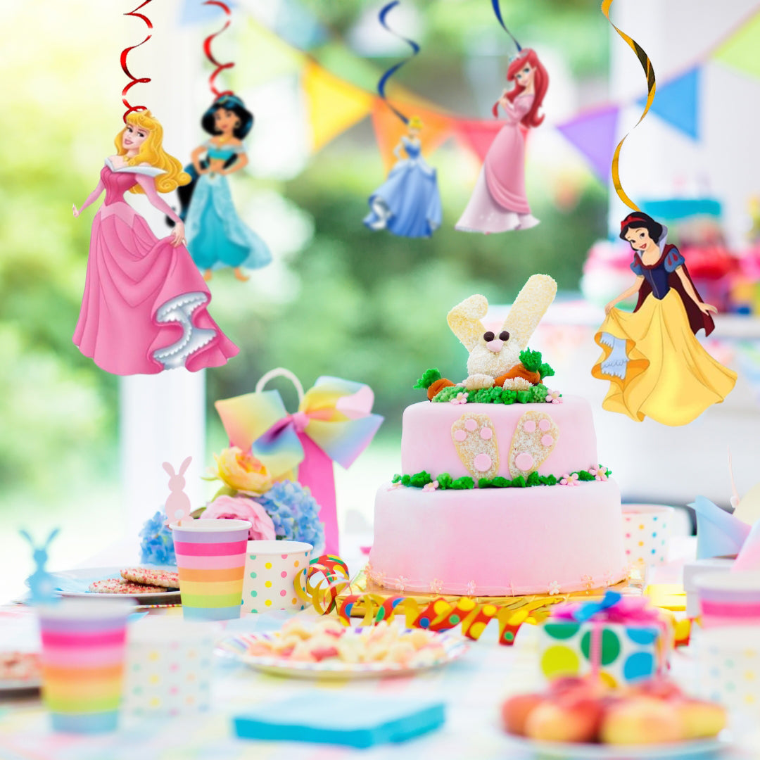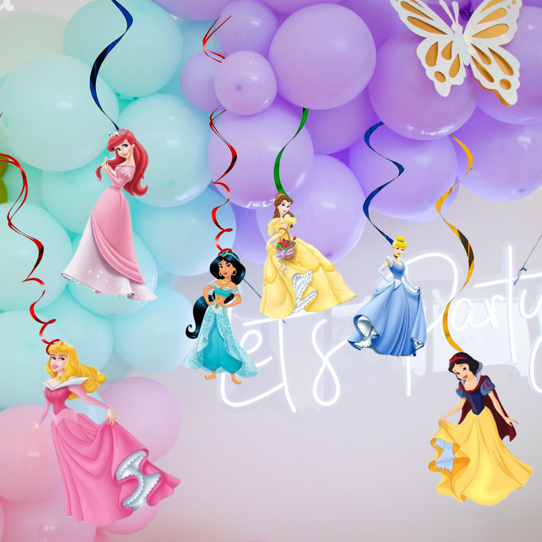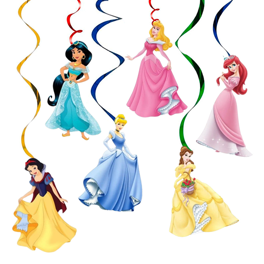 12PCS Princess Hanging Swirls Whirls Decorations - 6 pcs Hanging Swirls with different princess theme patterns; 6pcs Hanging Swirls without pattern but with Double Whirls. Princess Hanging Swirls can be used as a booth props at the entrance of your party, over mantelpiece, or along buffet tables as background decoratio