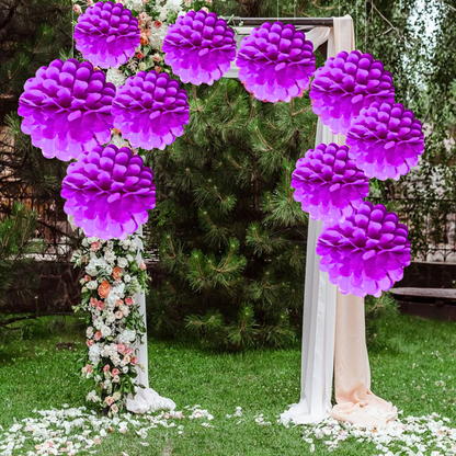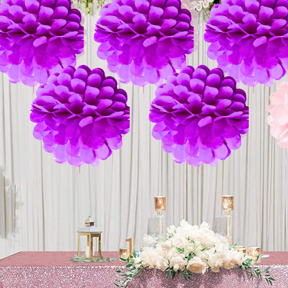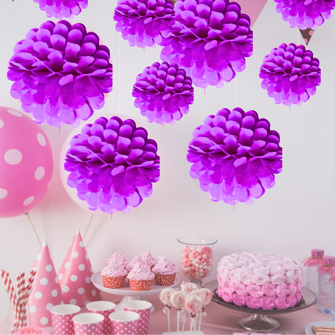 Striking Purple Decor: Infuse your celebrations with a splash of vibrant purple using these beautiful paper pom poms. Their rich hue brings an air of elegance and whimsy, making them ideal for a variety of events such as birthdays, anniversaries, bridal showers, or themed parties. These fluffy decorations create a visually stunning focal point that captivates your guests.