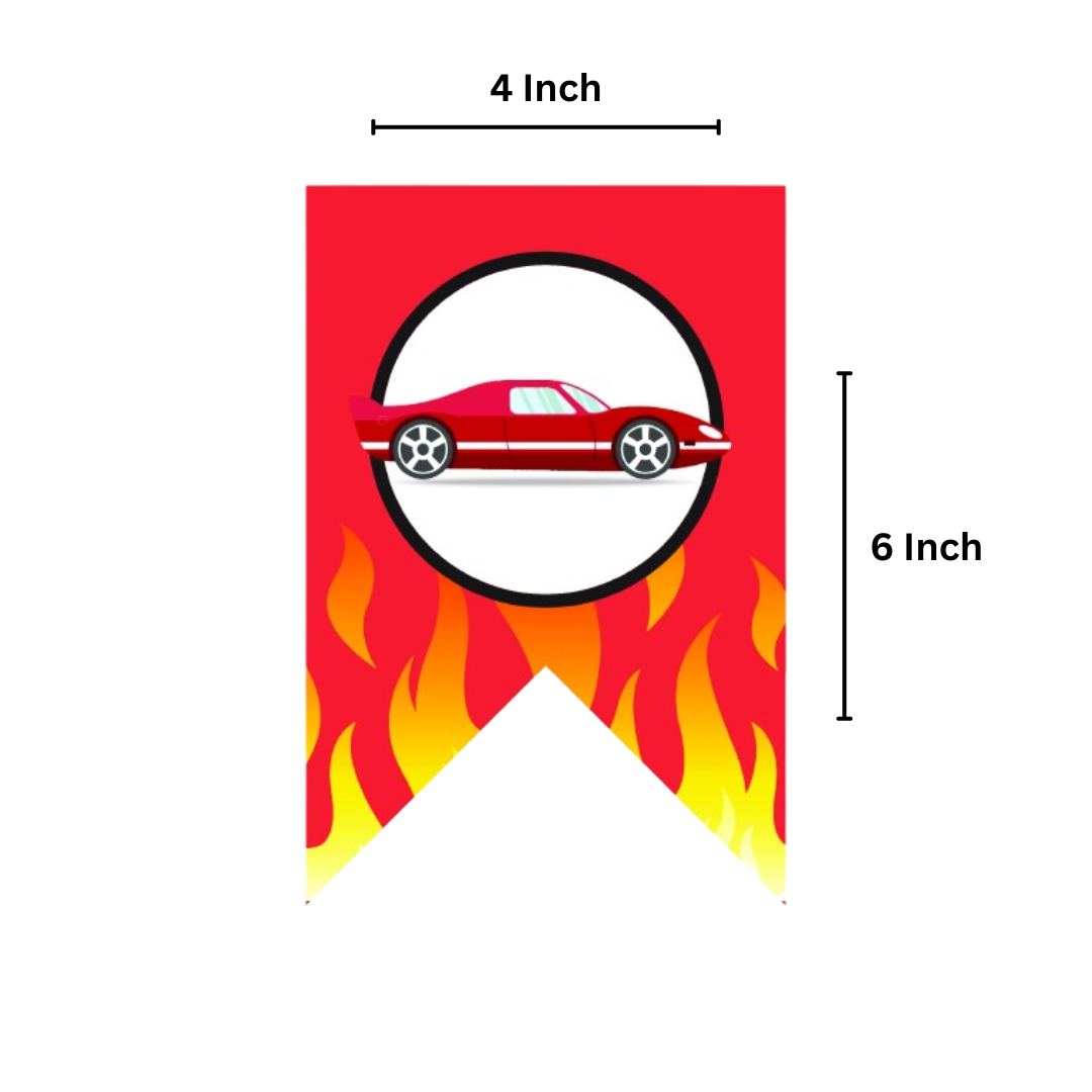 FEATURE- The Racing Cars Happy Birthday Banner features an alternating pattern of red flame and black-and-white checkered flag designs. This dynamic contrast creates a visually captivating display, evoking the spirit of a thrilling race. Each banner piece showcases an individual letter spelling out "HAPPY BIRTHDAY."