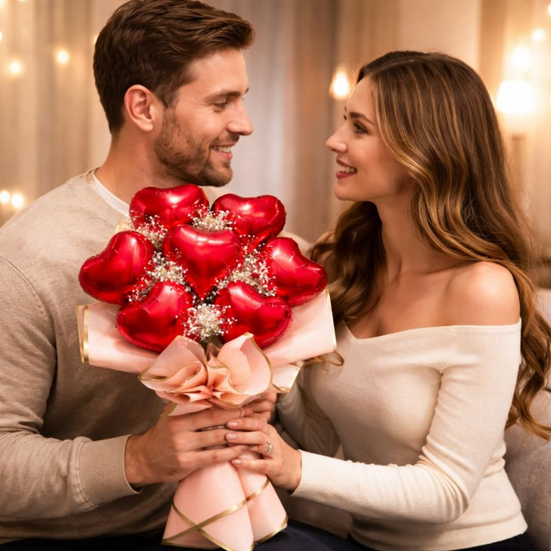 Red Heart Shape Foil Balloon Set w/ Gymsum Flowers - Air Filled - 10 inches - 7PC