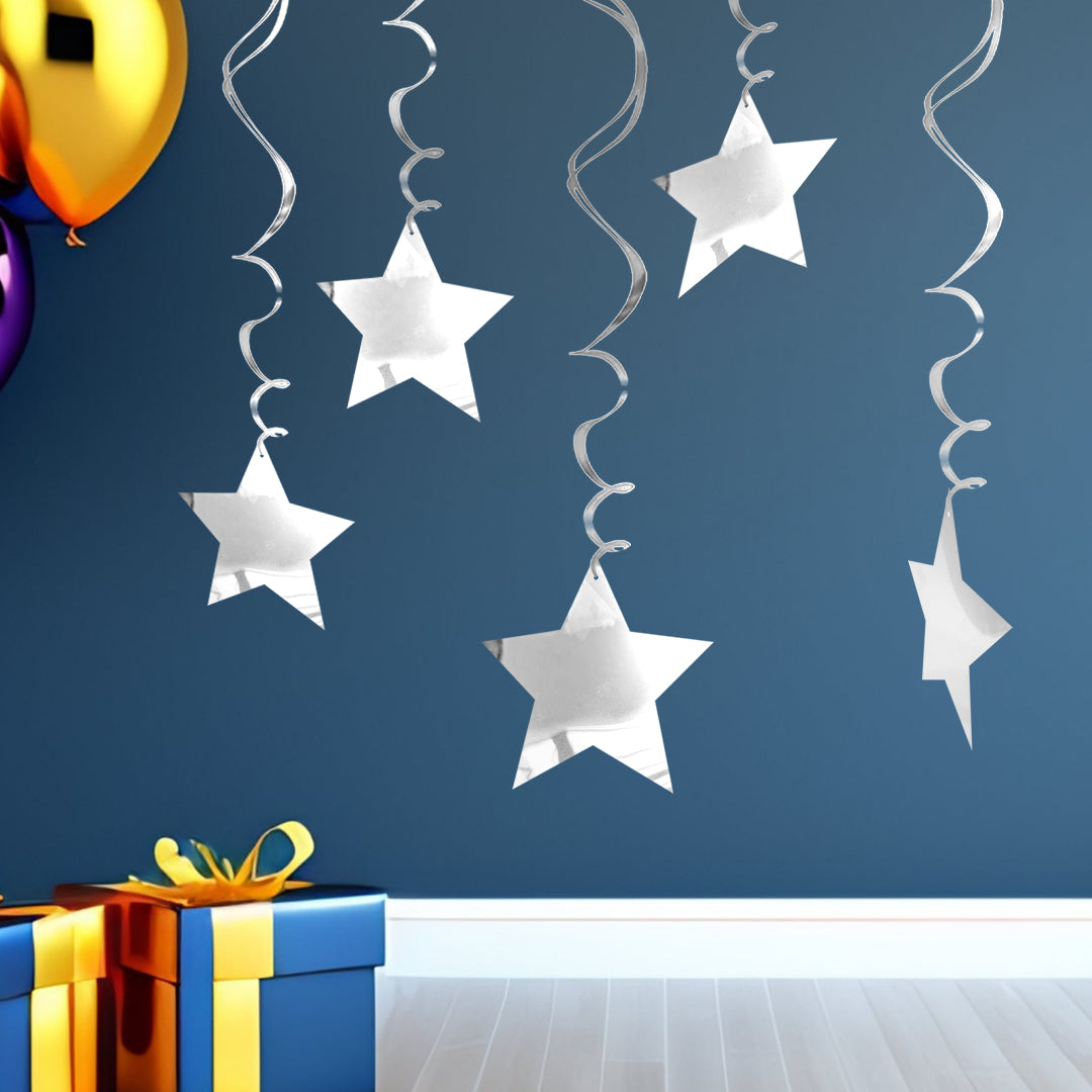 Let sterling starlight shine at your party or special event with our Silver Hanging Swirl Decorations! Package includes 15 swirl decorations. Each feature a die-cut foil star attached to a silver metallic swirl that shimmers as it twirls. A plastic loop is attached at top for easy hanging. Decoration is perfect to hang from a ceiling or doorway to instantly bring a fun mood to your party.