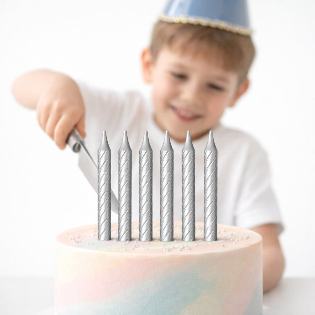 Your cake stands above the rest with this Silver Swirl Candle that comes in a pack of 12. These candles make a big statement on top of your birthday cake. The classic silver colour adds a touch of elegance to your display and makes them a great addition to your anniversary cake or silver-themed event. Place these birthday candles on birthday cakes, cupcakes, cookies, or any other delectable dessert!