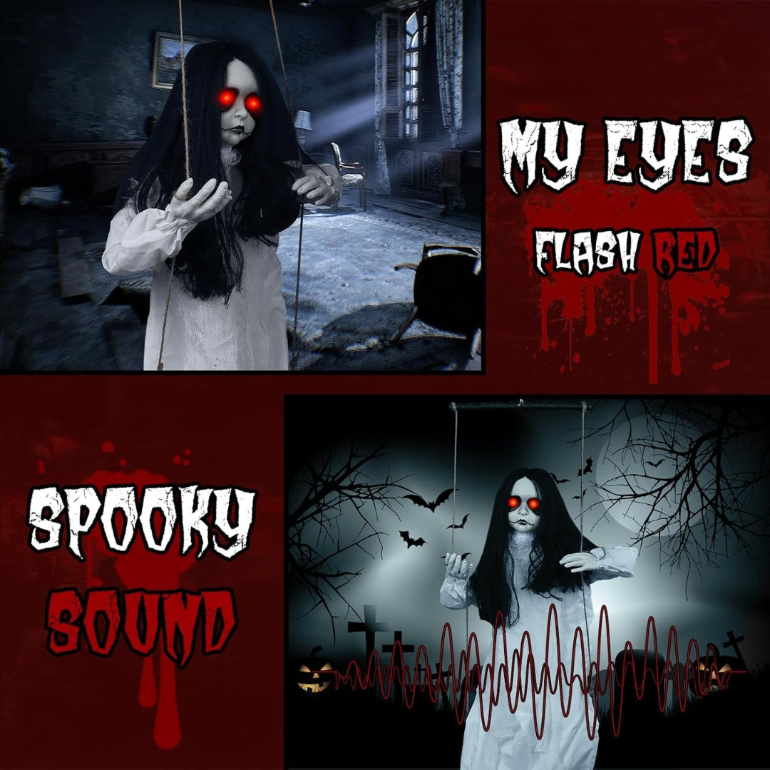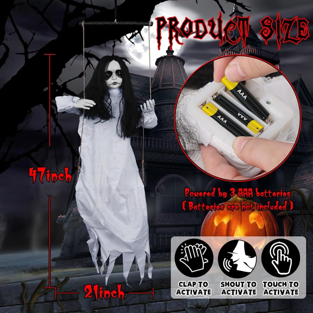 Creepy 4 Ft Tall Spooky Doll – A terrifying life-size haunted doll sitting on a swing sensor operated,measuring 4 feet tall, designed to give a spine-chilling effect to your Halloween décor.