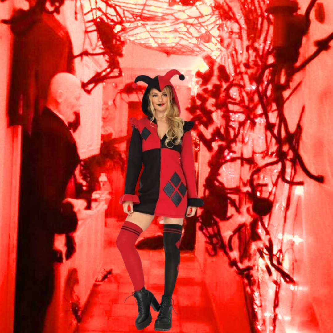 Playful Jester-Inspired Look – This Harley Quinn style costume features a red and black hooded mini dress with diamond patterns.and playful jester accents for a fun villainous vibe.