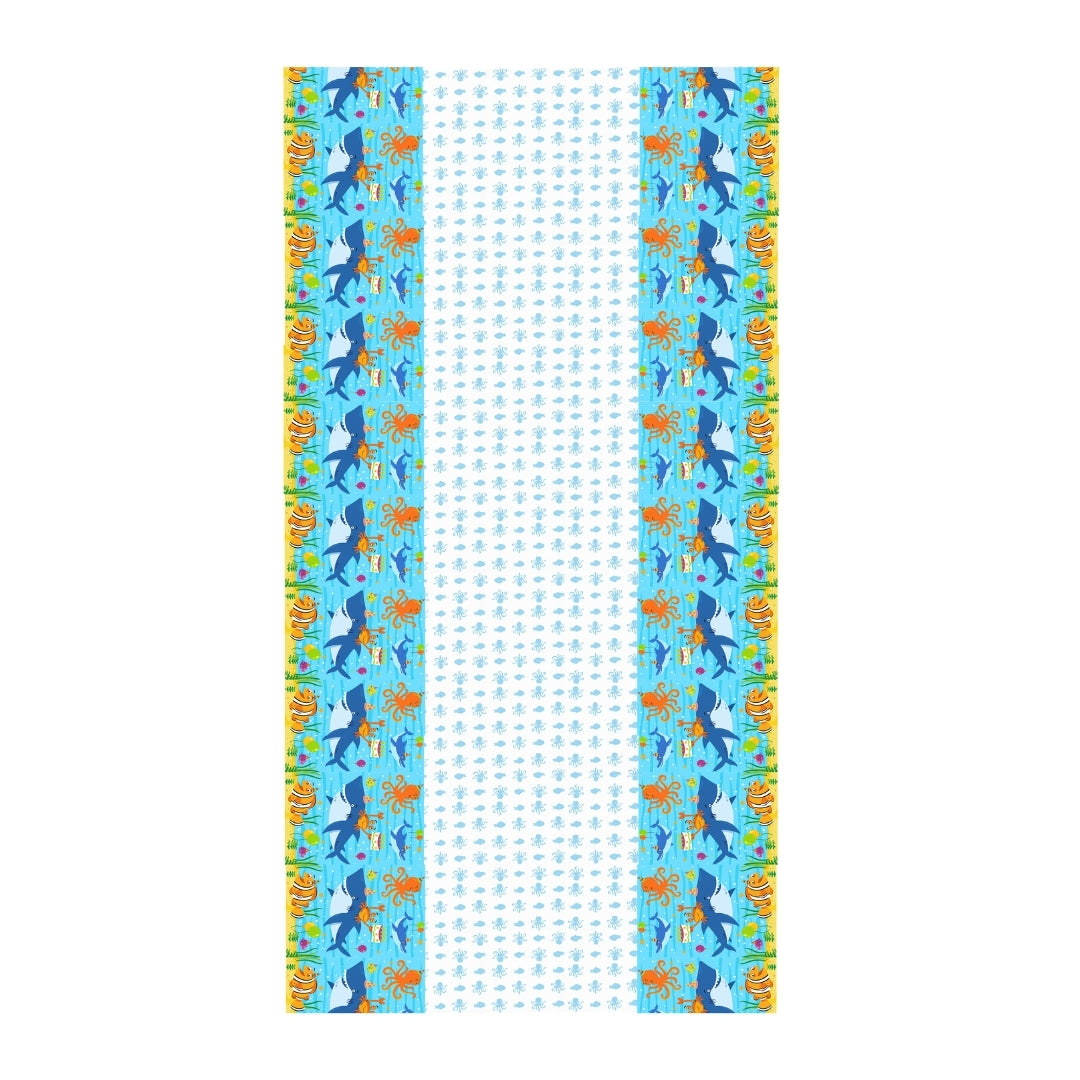 Dive into Fun: Create a vibrant, underwater world for your next celebration with this eye-catching tablecover. The lively design features a cast of friendly sea creatures, including playful sharks, curious octopuses, and colorful clownfish, all swimming along a beautifully illustrated ocean scene. It's the perfect way to bring your "Under the Sea" or "Ocean Theme" party to life.