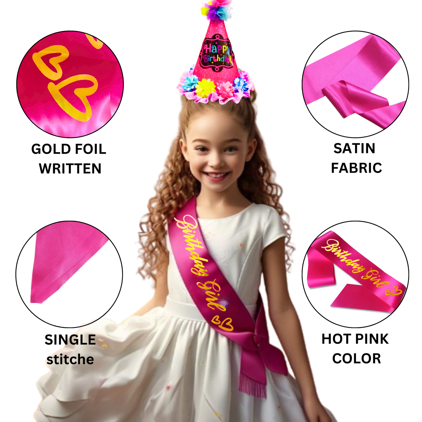Pink Happy Birthday Floral Conical Hat & Sash Combo for Girls - Set of 2