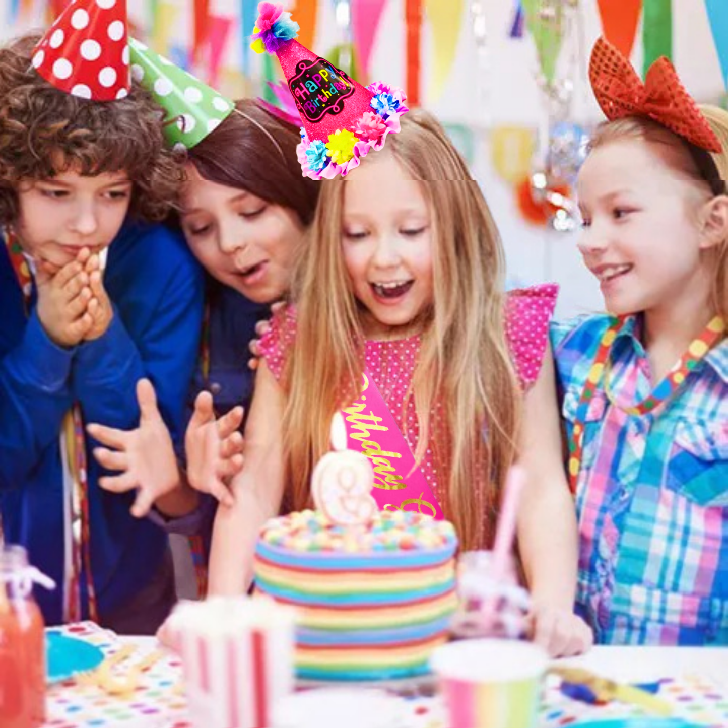 Sparkling Hot Pink Glitter: The birthday hat is crafted from sturdy cardboard and covered in vibrant hot pink glitter, adding a dazzling, eye-catching effect.