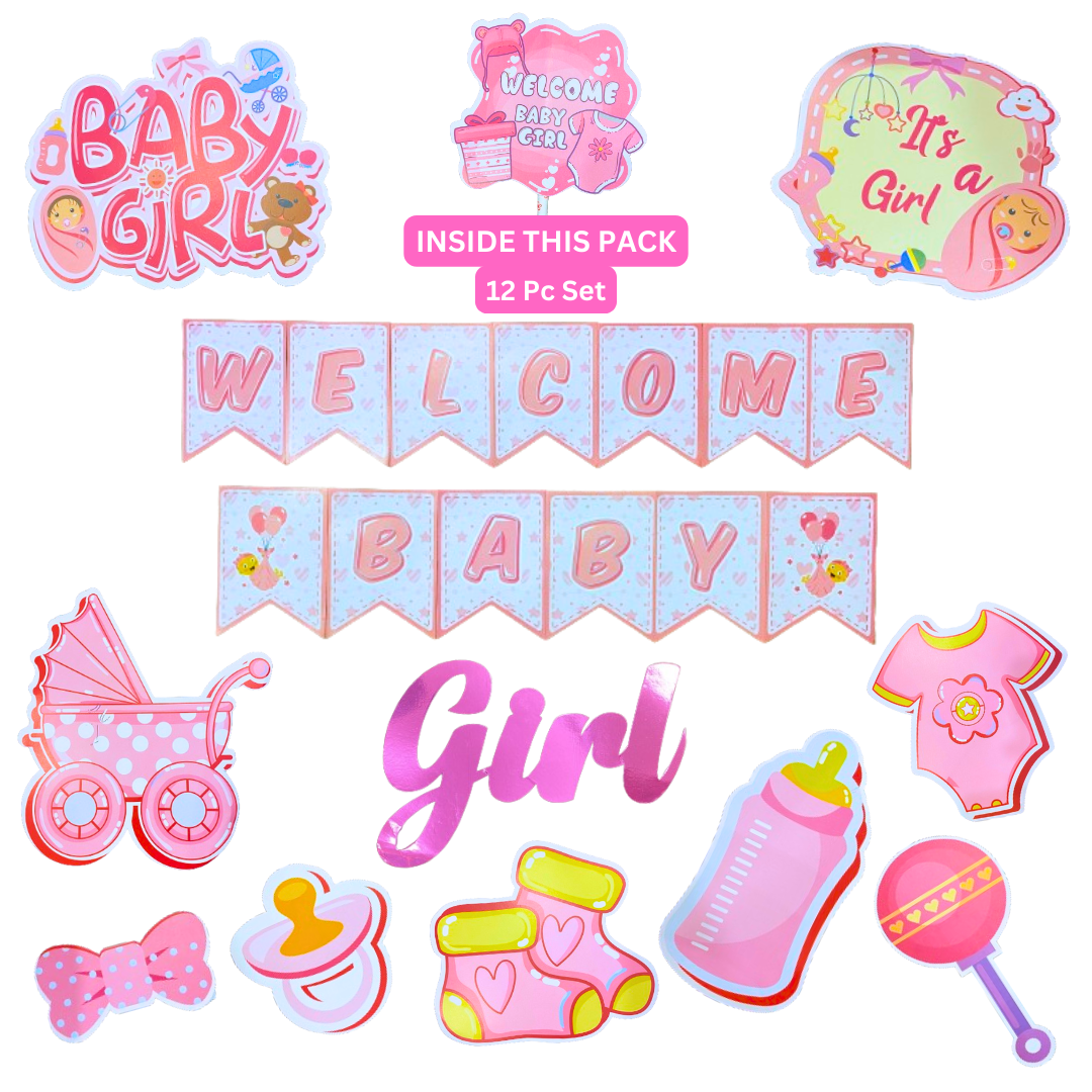 Celebrate the Arrival in Style: Welcome your little bundle of joy with our Welcome Baby Girl Party Set - a delightful collection of 12 pieces that add a touch of charm and celebration to the joyous occasion. This set is thoughtfully curated to make the arrival of your baby girl even more special.