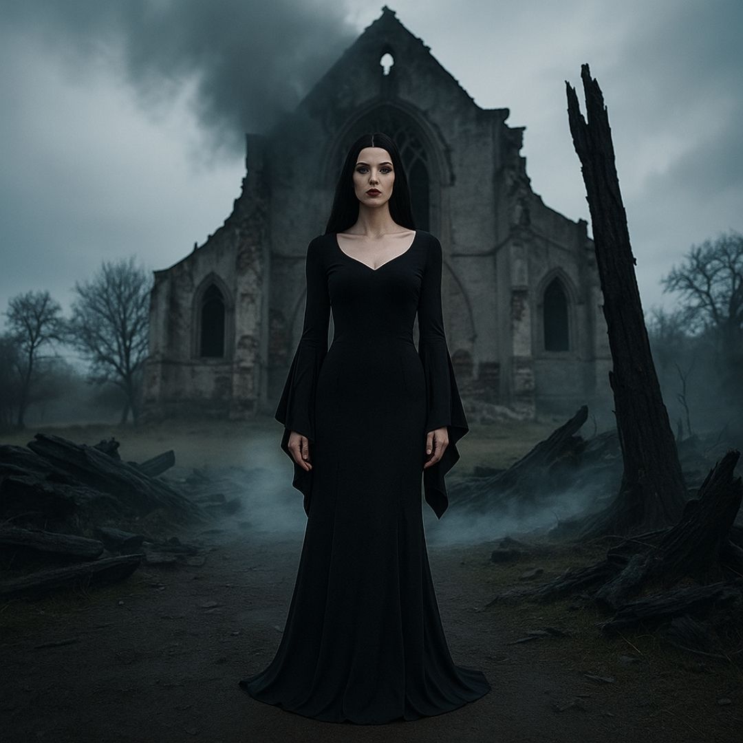 Iconic Design Inspired by Morticia Addams: Step into the mysterious world of the Addams family with this elegant Morticia Addams costume. Featuring a long black gown with flared sleeves and a curve-hugging silhouette, this look captures the timeless charm and gothic elegance of Wednesday’s captivating mother.